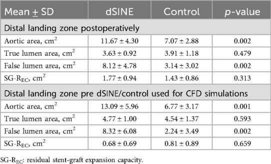Table 2 presents the aortic measurements at the distal landing zone from both postoperative CTA images and scans used for the CFD simulations. The dSINE group had a significantly larger aortic area both postoperatively (11.67 ± 4.30 cm2 vs. 7.07 ± 2.88 cm2, p = 0.002) and before dSINE (13.09 ± 5.96 cm2 vs. 6.77 ± 3.17 cm2, p = 0.001) compared to the control group. Similarly, the FL area was significantly larger in the dSINE group at both time points, whereas the TL area was comparable between groups.