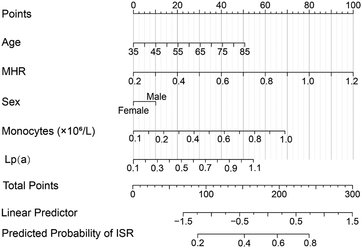 The results of the logistic regression analysis are presented in Table 4. Evaluation of various clinical and biochemical parameters revealed that NT-proBNP (OR = 2.055, 95% CI: 0.585–2.914, P = 0.826), HDL-C (OR = 0.178, 95% CI: 0.007–4.965, P = 0.311), and white blood cell count (OR = 1.057, 95% CI: 0.927–1.394, P = 0.089) were not significantly associated with ISR. While the association between SYNTAX score and ISR approached significance (P = 0.086), it did not reach the threshold for statistical significance, suggesting a limited relationship with ISR risk. Notably, although HDL-C exhibited an OR less than 1, indicating a potential protective trend, this finding was not statistically significant. In contrast, monocyte count, Lp(a), and MHR were significantly elevated in the ISR group and identified as independent risk factors for ISR. The OR for monocyte count was 1.949 (95% CI: 1.132–3.317, P = 0.017), indicating that elevated monocyte levels significantly increased ISR risk. Lp(a) showed an OR of 1.22 (95% CI: 1.02–1.48, P = 0.046), suggesting it as a potential risk factor. Furthermore, MHR had an OR of 1.009 (95% CI: 1.002–1.012, P = 0.032), demonstrating that higher MHR levels may contribute to increased ISR occurrence. These findings highlight the important roles of elevated monocyte count, Lp(a), and MHR in the development of ISR, providing valuable references for clinical risk monitoring and intervention.