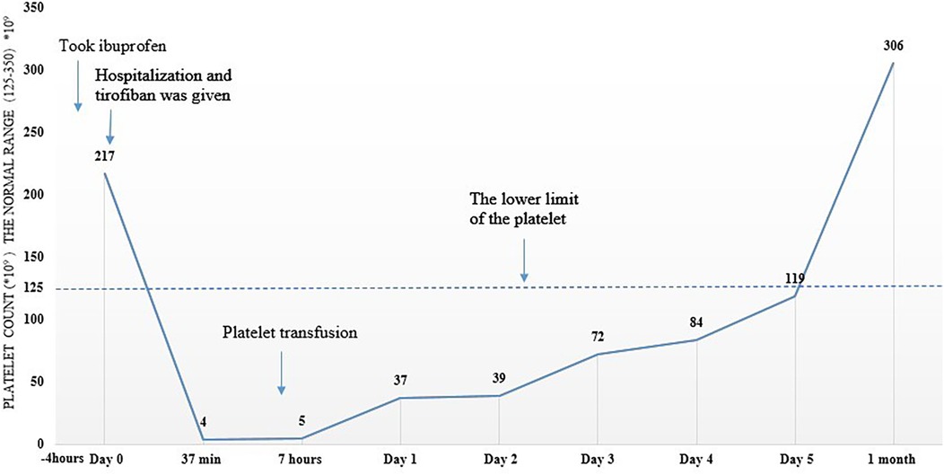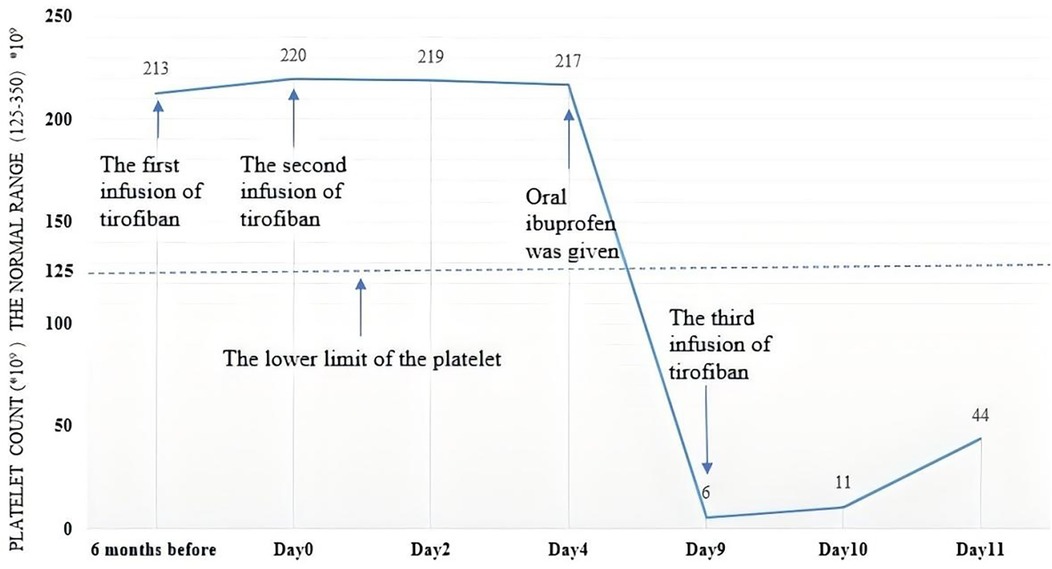 A 52-year-old male patient, with no significant past medical history, was admitted with symptoms of dizziness, nausea, headache, and vomiting persisting for more than 20 h. Cerebral magnetic resonance imaging (MRI) detected acute/subacute cerebral infarction in the left cerebellar hemisphere and cerebellar vermis, multiple ischemic infarcts in the brain, and severe stenosis or occlusion of the right middle cerebral artery. Prior to hospital admission, the patient took ibuprofen to relieve his headache. His platelet count was normal (217 × 109/L) before dosing. He was treated with 0.1 g of aspirin and 300 mg of clopidogrel daily. Tirofiban was administered intravenously at a dose of 0.4 µg/kg/min for 30 min, followed by 0.1 µg/kg/min. After 37 min of tirofiban infusion, the patient developed epigastric discomfort, chest tightness, lip cyanosis, and chills. The patient's axillary temperature was 38.8 °C, arterial oxygen saturation at the fingertip was approximately 90%, and blood pressure was 146/73 mmHg. Acute allergic reaction was prime considerations. Tirofiban was discontinued and Dexamethasone (5 mg) was administered intravenously. Urgent blood routine examination revealed a rapid drop in platelet count to 4 × 109/L. Aspirin and clopidogrel were discontinued immediately, and methylprednisolone sodium succinate (40 mg) was administered via intravenous drip. One unit of platelets (2.5 × 1011, 250 mL, Leukocyte-depleted irradiated apheresis platelets) was transfused, and pantoprazole (40 mg) was given twice a day. After 3 h, the platelet count was 5 × 109/L, and it gradually returned to normal over the next 5 days. Aspirin and clopidogrel were resumed when the platelet count exceeded 84 × 109/L. Throughout this period, the patient did not exhibit any signs of bleeding and was safely discharged. He was followed up regularly in the outpatient clinic for one year, during which the platelet count remained stable. Changes in platelet count are shown in Figure 1.
