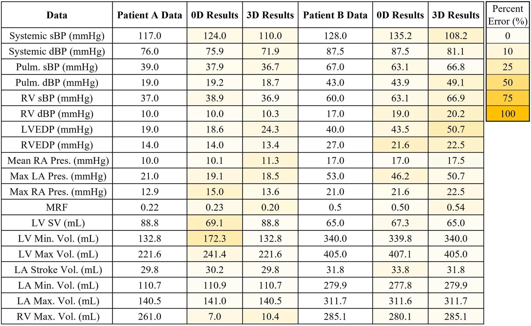 Patient specific results for model validation compared to Patient A data and Patient B data. The results of the 0D and 3D-0D models are shaded to indicate percentage error. In the case of Patient A, poor contrast in the right heart did not allow for measurement of the right ventricle blood volume.