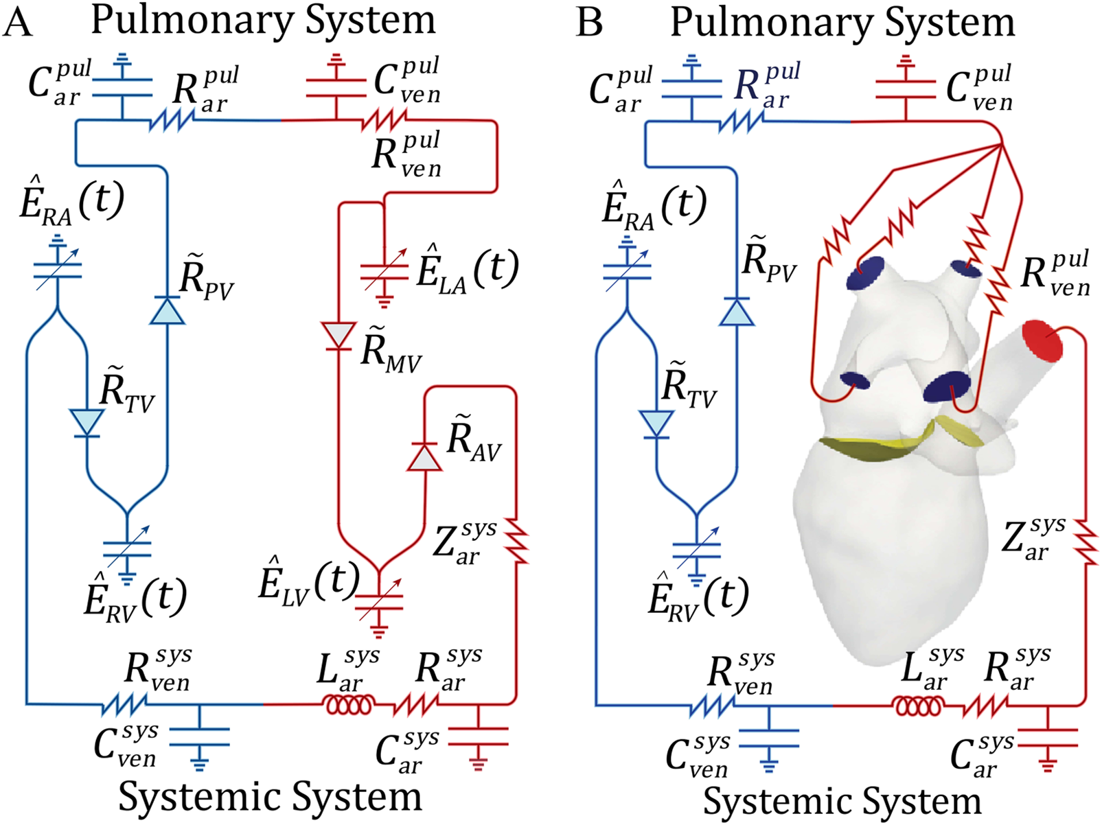 Schematic representations of the 0D Windkessel and 3D-0D models: (A) 0D model used for parameter optimization, (B) 3D-0D closed loop model in which Neumann BCs are applied to the aortic root outflow face (, red) and pulmonary veins (, blue) and coupled to the 0D model with a Lagrange multiplier. The flow is controlled by the mitral () and aortic valves () shown in yellow. R or Z, resistance; C, capacitance; L, inductance; , time varying elastance; pul, pulmonary; sys, systemic; ven, veins; ar, arteries; , pressure dependent valve resistance; RV, right ventricle; RA, right atrium; LV, left ventricle; LA, left atrium; TV, tricuspid valve; PV, pulmonary valve; MV, mitral valve; AV, aortic valve.