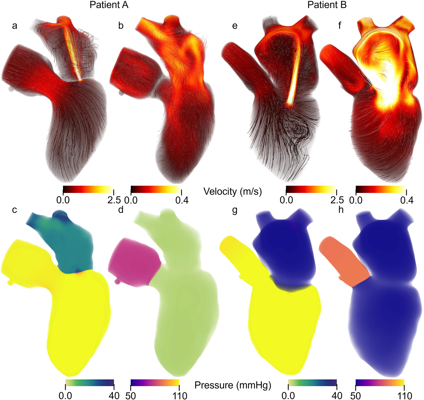 Patient specific Velocity and pressure fields during peak systole and diastole. Streamlines colored according to velocity magnitude for Patient A during (a) peak systole and (b) peak diastole as well as Patient B at (e) peak systole and (f) peak diastole. Note that the velocity range is the same for peak systole between patients A and B but different for peak diastole. Volume rendering of the pressure for Patient A at (c) peak systole and (d) peak diastole and for Patient B and (g) peak systole and (h) peak diastole.