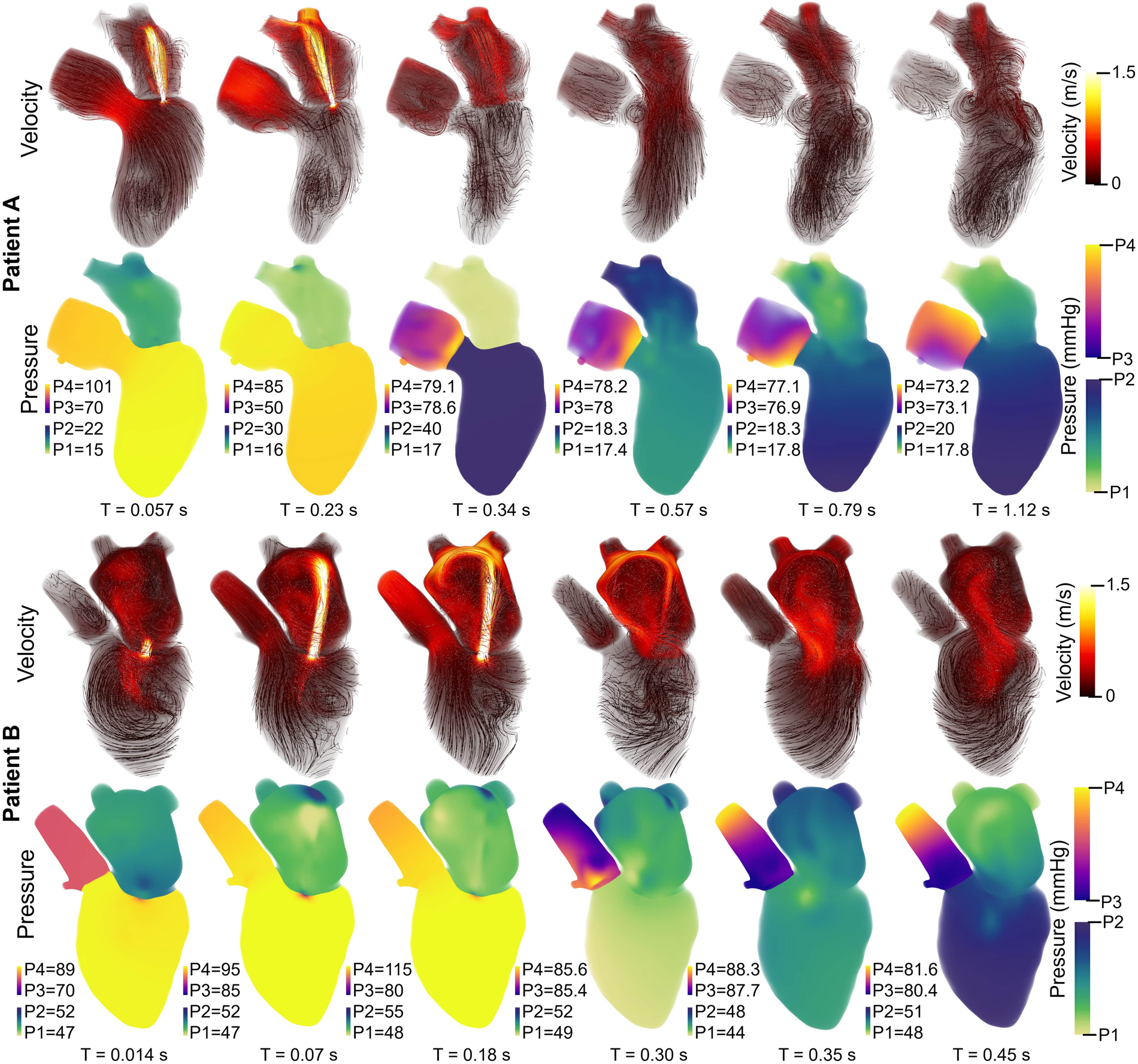 Velocity streamlines (colored by magnitude) and pressure fields with volume rendering for Patient A (upper panel) and Patient B (lower panel) over the cardiac cycle. The pressure colorbar ranges vary and are indicated to the left of each sub-image.