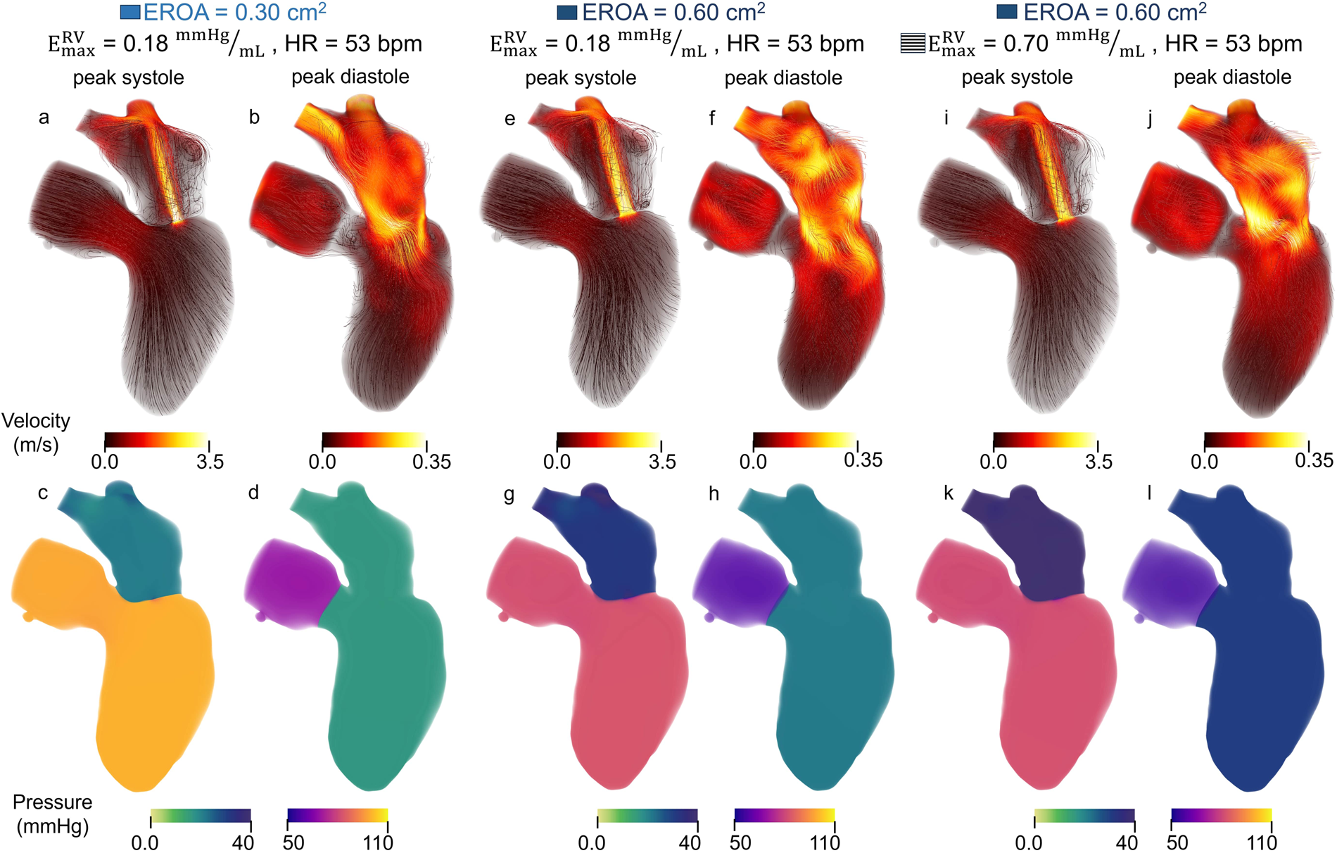 Velocity and pressure during peak systole and mid diastole for models with (a–d) moderate EROA and maximum RV elastance of 0.18 mmHg/mL, (e–h) moderate EROA and maximum RV elastance of 0.70 mmHg/mL, (i–l) severe EROA and maximum RV elastance of 0.70 mmHg/mL. Streamlines are colored according to velocity magnitude and pressure is visualized with volume rendering.