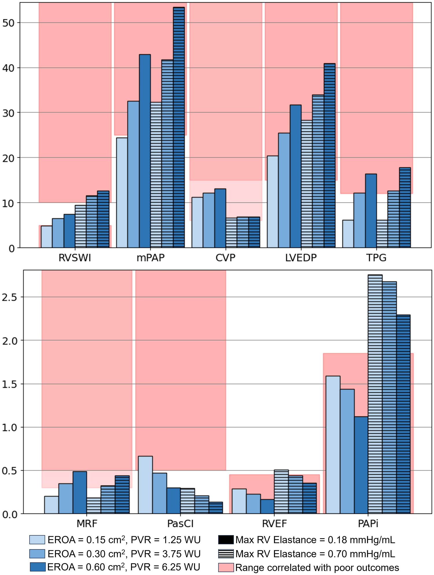 Clinical metrics associated with RV function and outcomes for varying EROA are presented as the solid bars in Figure 8, where increasing severity is shown with progressively darker blue shades. Increasing EROA decreased RVEF by 24.4% on average. The right ventricle pressure-volume loops for different EROA’s are shown in Figure 7. Greater MR severity increases the right ventricle end diastolic volume and decreases the right ventricle stroke volume, which accounts for the decrease in RVEF. Larger EROAs also increased regurgitant flow into the pulmonary system, raising pulmonary pressures. This led to increases in mPAP, TPG, and other RV-afterload-related metrics shown in Figure 8. In particular, TPG exceeded 12 mmHg for the larger EROAs, and mPAP rose above the 25 mmHg threshold.