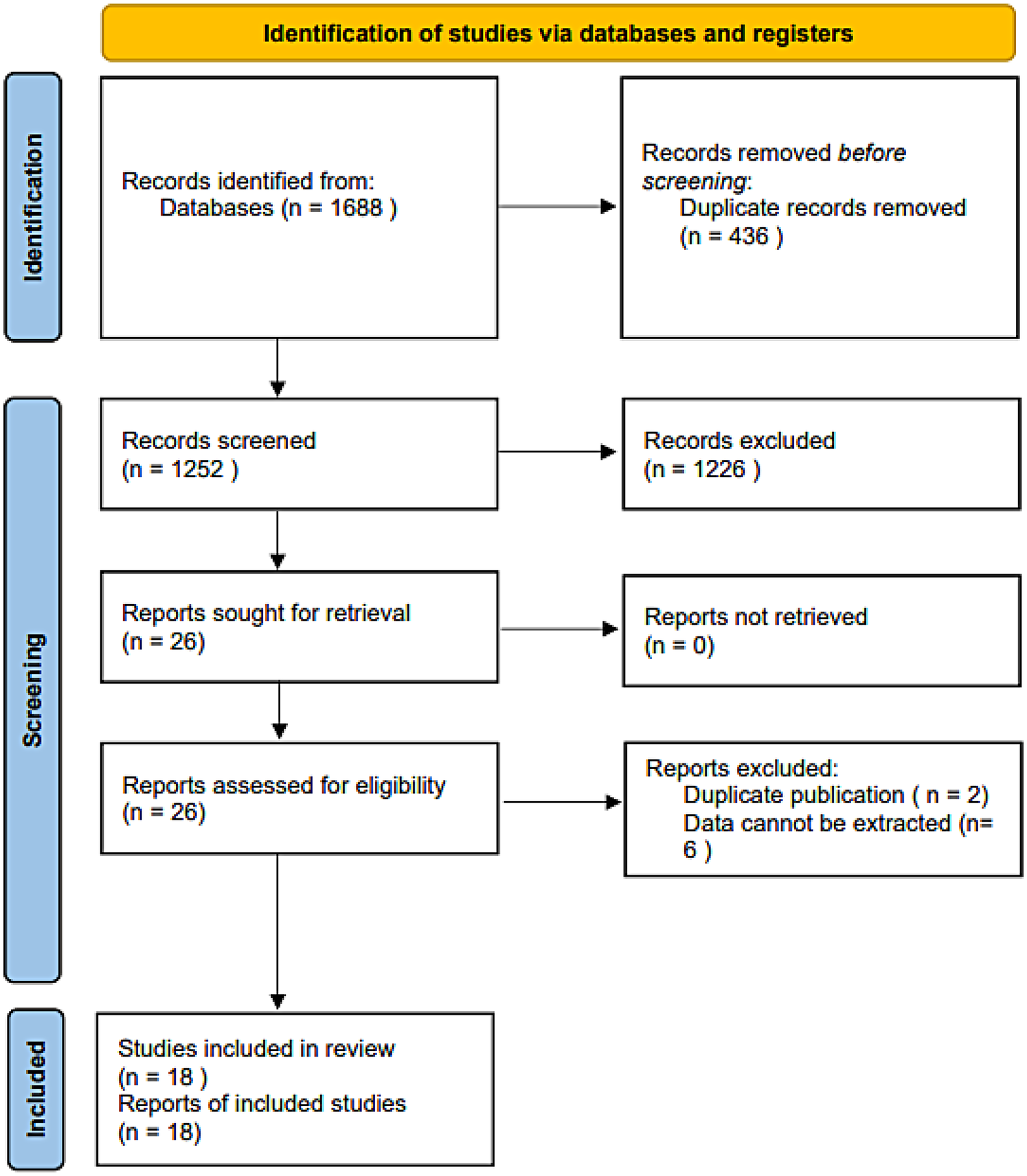 The initial database search identified 1,688 relevant records. After removing 436 duplicates, 1,226 records were excluded based on title and abstract screening. Following a full-text review of the remaining articles, eight were excluded for not meeting the eligibility criteria. Ultimately, 18 studies (17–19, 24–38) were included in the meta-analysis (Figure 1).