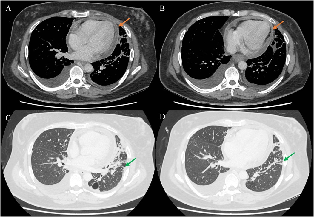Figure 1. CT of the chest of the patient using different windows. (A,B) The chest CT in the soft tissue/mediastinal window, highlighting the pericardium (orange arrow) surrounding the heart. The findings are consistent with acute pericarditis with an associated pericardial effusion. (C,D) The lung window, in which streaky consolidation in the left lung is more clearly visualized (green arrow). CT, computed tomography.