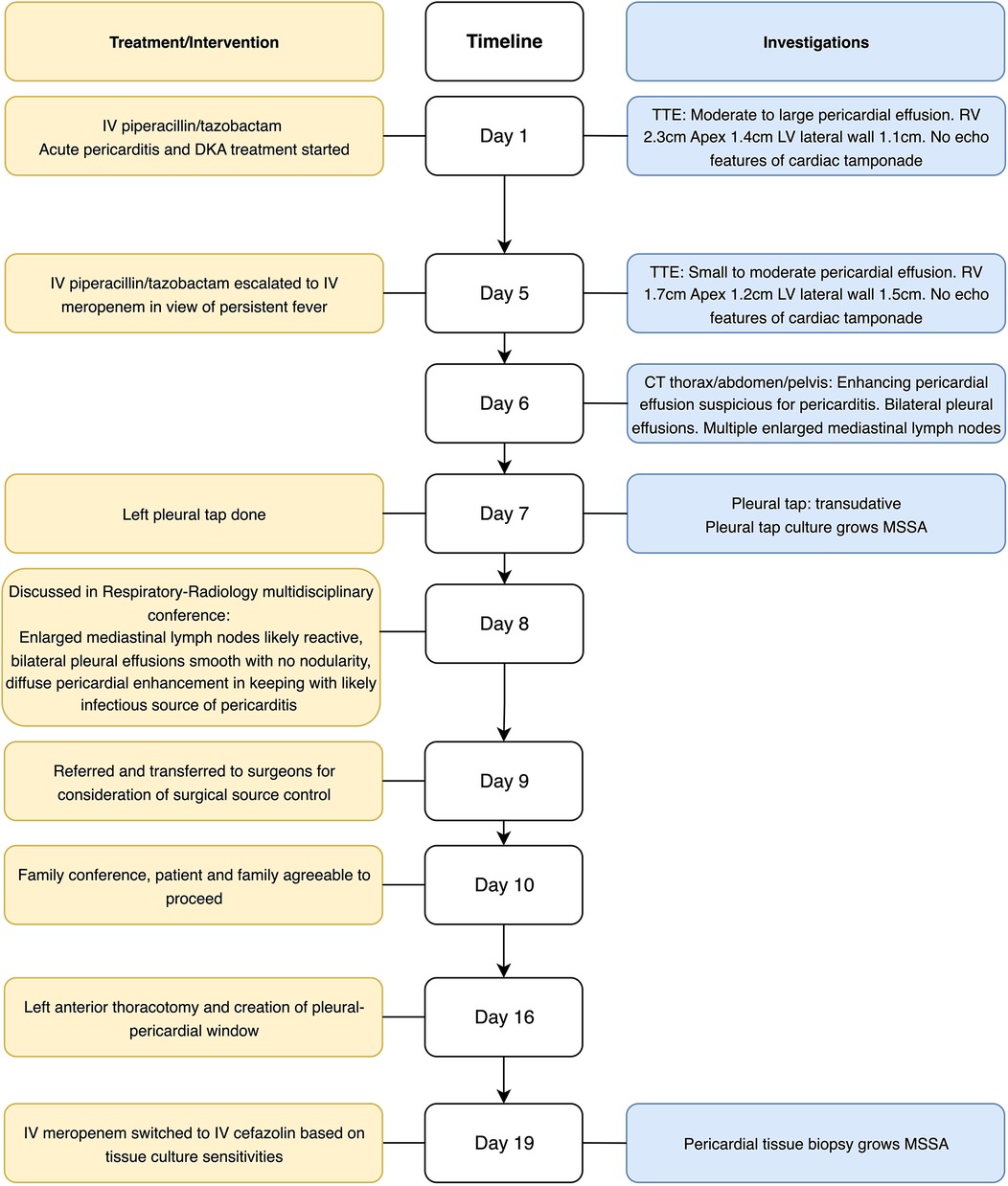 Figure 2. Timeline of admission. CT, computed tomography; DKA, diabetic ketoacidosis; IV, intravenous; MSSA, methicillin-sensitive S. aureus; TTE, transthoracic echocardiogram; RV, right ventricle; LV, left ventricle.