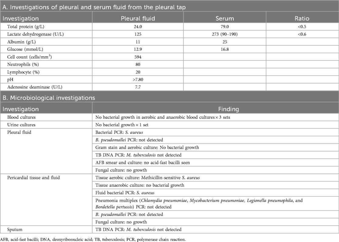 The intraoperative findings noted extensive adhesions with multiple pleural loculations and a serous pleural effusion. The pericardium was thickened and inflamed with minimal pericardial fluid or purulent material. The myocardial surface was also inflamed with dense adhesions within the pericardial cavity. A small section of the pericardium was excised to create the window, with specimens of pleural effusion and pericardium sent for histopathological culture and further analysis (Table 1B). The intraoperative tissue culture and bacterial PCR of the pericardial fluid both grew MSSA. Following surgery, the patient’s clinical status improved. The patient was discharged well and completed 6 weeks of IV cefazolin for MSSA pericarditis in an outpatient setting, with a full clinical recovery. A follow-up TTE 3 months after the completion of IV cefazolin showed that the pericardial effusion remained small, 2 mm at most adjacent to the RV, with the patient returning to her baseline health.