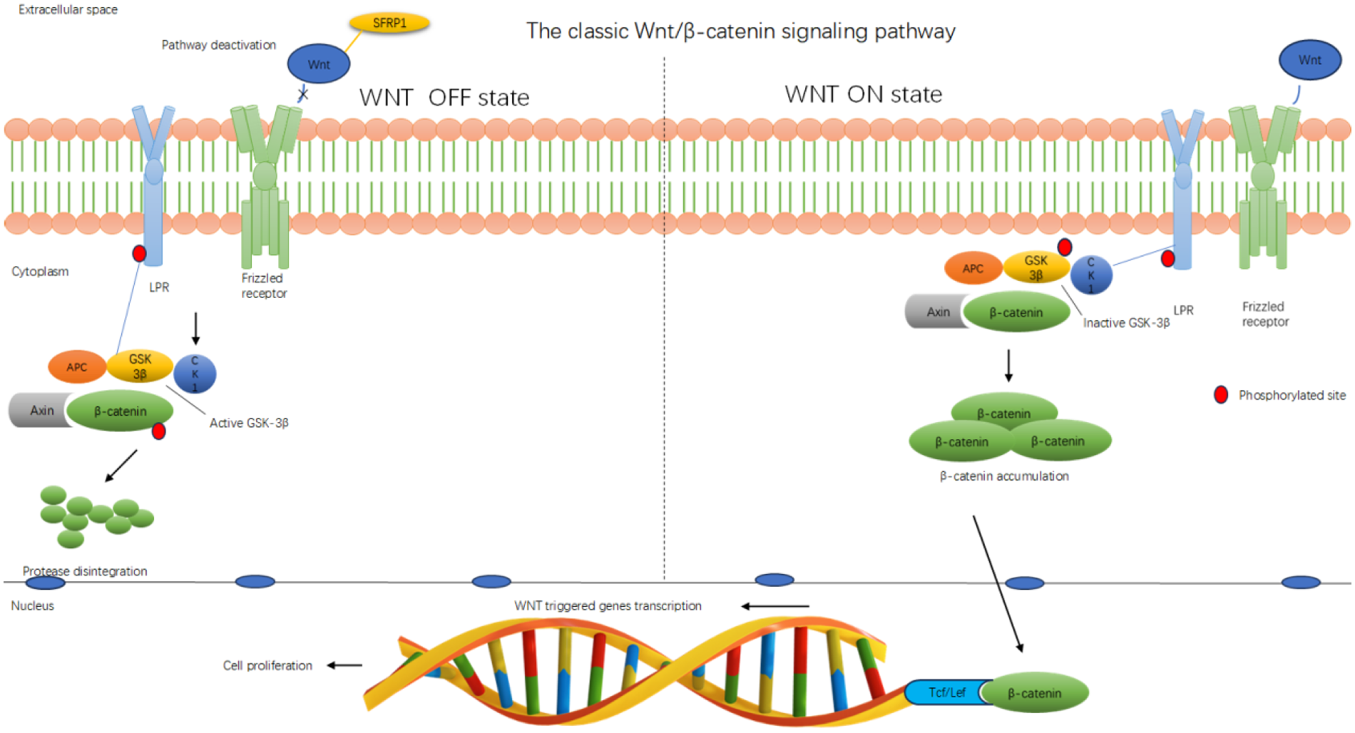 Sfrp1 inhibits the classical Wnt/β-catenin signaling pathway. Diagram illustrating the classic Wnt/β-catenin signaling pathway. The WNT OFF state shows pathway deactivation with SFRP1 inhibiting Wnt, leading to active GSK-3β degrading β-catenin. The WNT ON state shows Wnt binding to the receptor, inactivating GSK-3β and accumulating β-catenin, which translocates to the nucleus and interacts with Tcf/Lef for gene transcription, promoting cell proliferation. The membrane, cytoplasm, and nucleus are labeled. Red circles indicate phosphorylated sites.