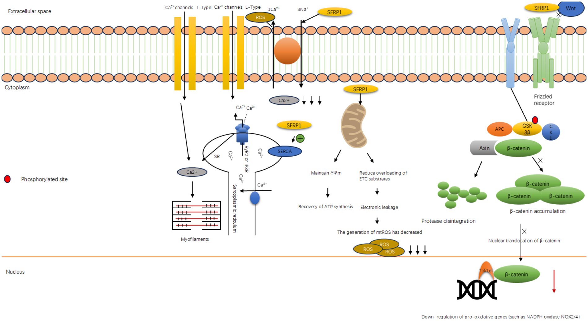 However, if ROS production exceeds the capacity of cells to eliminate it, it can lead to cellular and tissue damage, resulting in oxidative stress (73). The excessive production of reactive oxygen free radicals leads to an imbalance in the heart's antioxidant system, particularly in the context of the previously discussed pathological conditions. Targeted regulation of the ROS signaling pathway—most notably via restoration of antioxidant system balance—has emerged as a key therapeutic approach for intervening in the pathological process of apoptosis. This strategy aims to improve the prognosis for individuals with cardiovascular diseases (74). Some scholars have conducted research indicating that Sfrp1 is a key molecule in regulating the oxidative stress response (75). Under pathological conditions such as myocardial ischemia/reperfusion injury (I/R), the Wnt/β-catenin signaling pathway is often abnormally activated. The excessive activation of this pathway will promote mitochondrial dysfunction and upregulate the expression and activity of key pro-oxidative enzymes such as NADPH oxidase (NOX), leading to the explosive production of ROS within the cells. Sfrp1 effectively inhibits the activation of the downstream β-catenin signaling pathway by directly binding to the Wnt protein and blocking its binding to the cell membrane receptor Frizzled and the LRP5/6 complex (63, 76). Some researchers have conducted studies showing that in the myocardial ischemia/reperfusion (I/R) model, the overexpression of Sfrp1 significantly reduces the nuclear translocation of β-catenin and the expression of its downstream target genes, such as c-Myc and Cyclin D1. Additionally, Sfrp1 leads to a noticeable decrease in the levels of NOX2 and NOX4 proteins in myocardial tissue, resulting in lower mitochondrial superoxide production (see Figure 3). This evidence demonstrates that Sfrp1 inhibits the primary cellular source of ROS by suppressing the classical Wnt signaling pathway (63, 77).