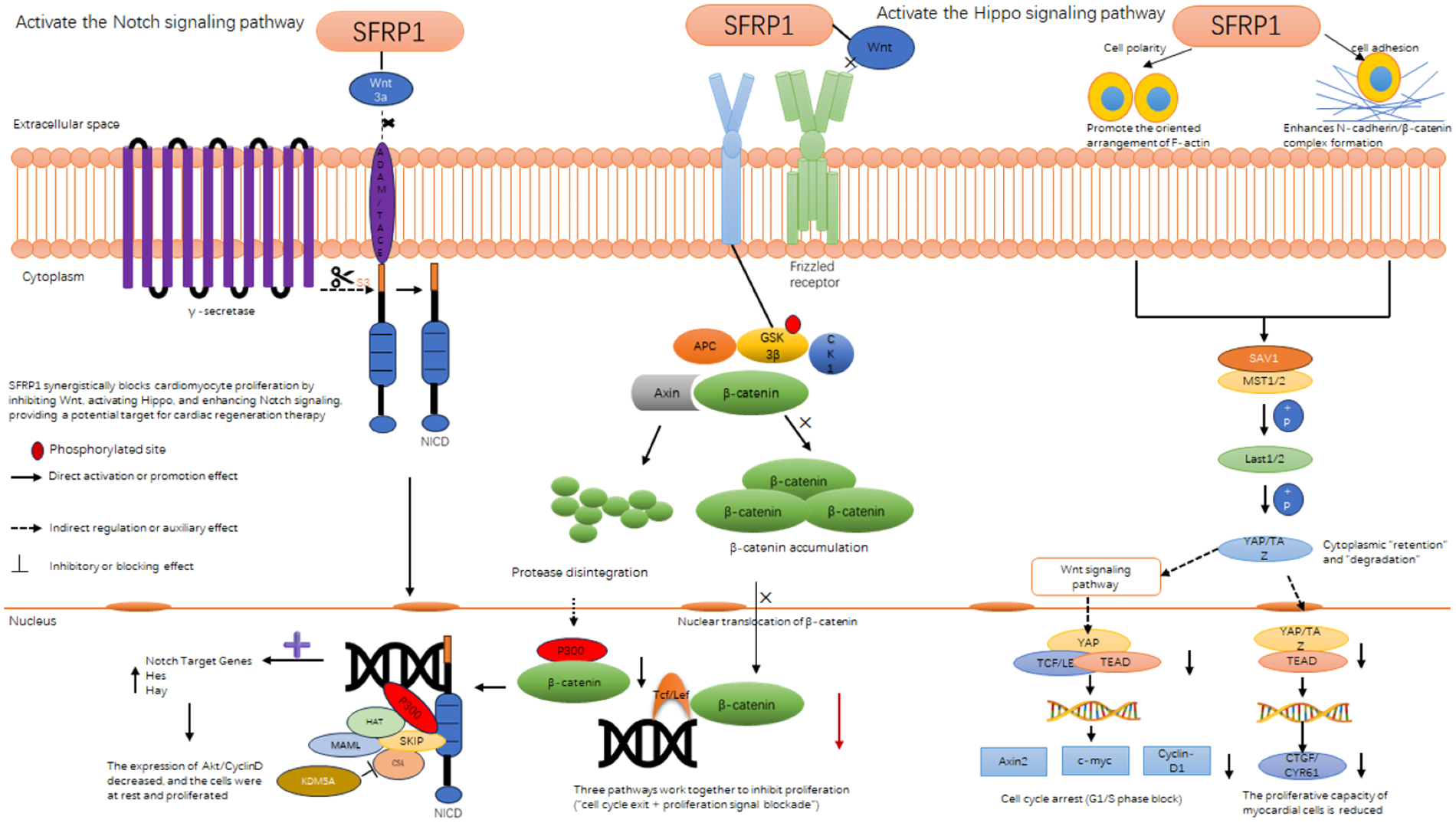 Pathological cardiac cell proliferation, a key driver of ventricular remodeling in HF, mainly includes two harmful subtypes: (1) pathological cardiomyocyte proliferation (abnormal re-entry of mature cardiomyocytes into the cell cycle, leading to myocardial hypertrophy), and (2) activated cardiac fibroblast proliferation (differentiation into myofibroblasts, promoting collagen deposition). Secreted frizzled-related protein 1 (Sfrp1) exerts selective inhibitory effects on both subtypes by orchestrating the cross talk of Wnt/β-catenin, Hippo, and Notch signaling pathways, without interfering with physiological myocardial repair. The following sections elaborate on its regulatory mechanisms and experimental evidence.
