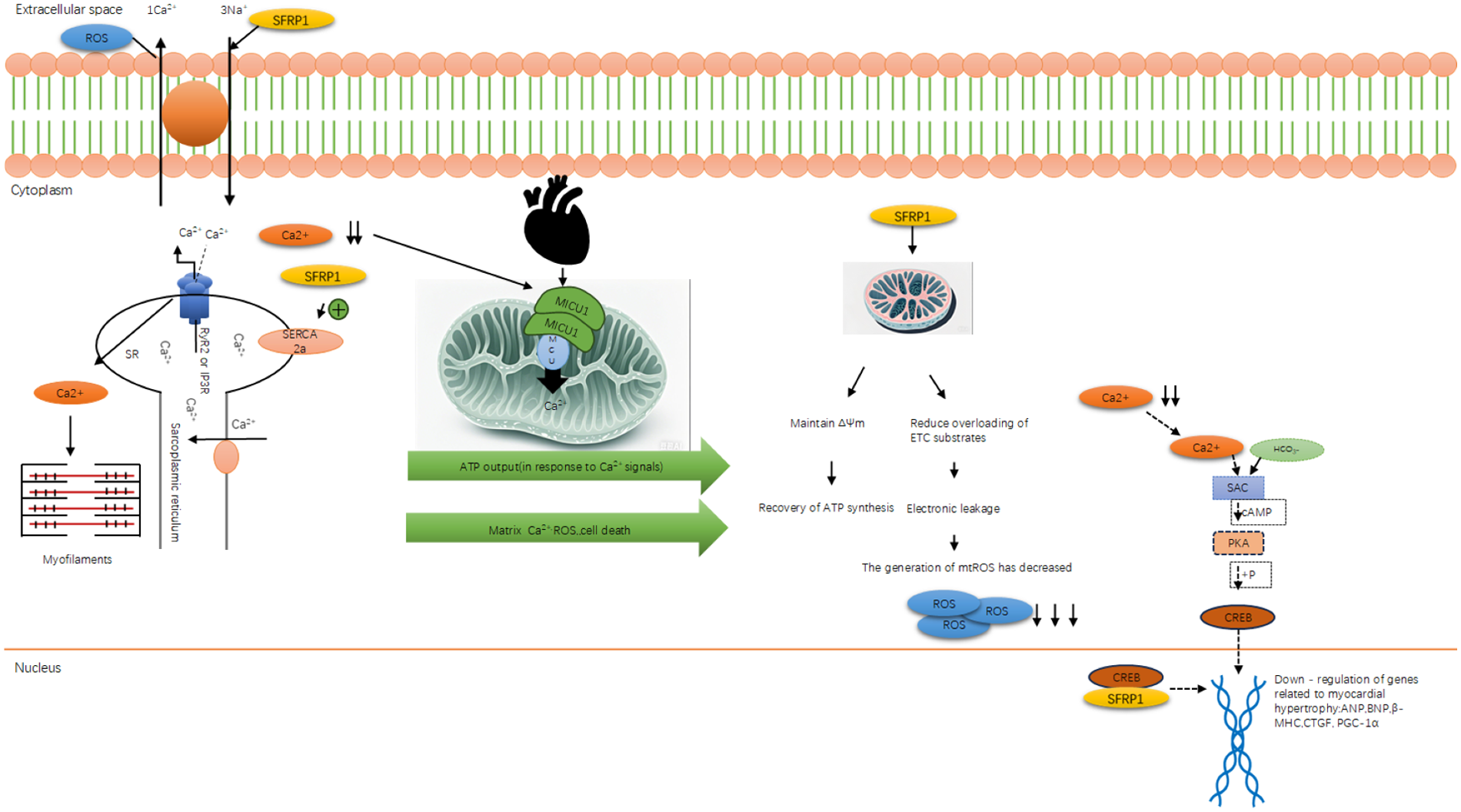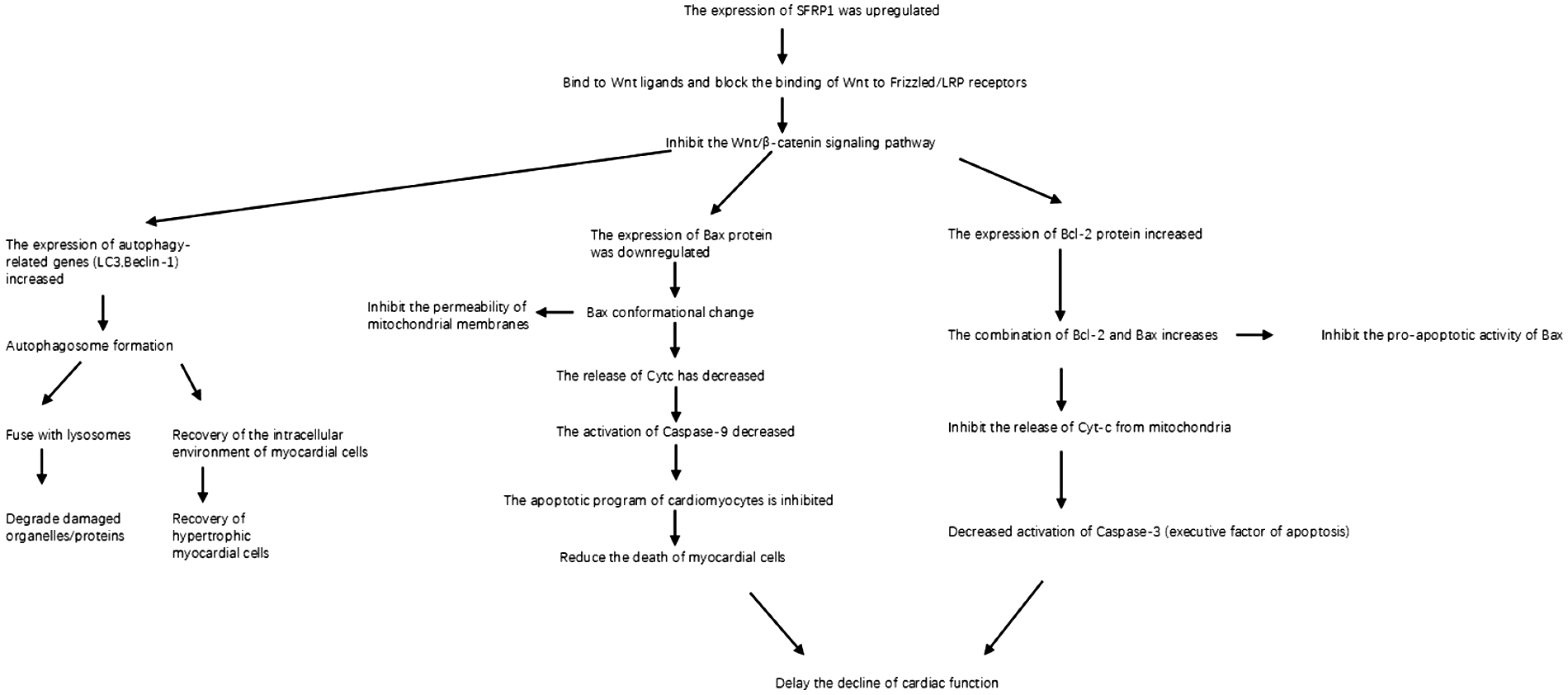 This review summarizes the molecular mechanisms by which Sfrp1 alleviates cardiomyocyte damage and delays HF progression, providing a theoretical basis for targeted therapy. We integrated domestic and international experimental studies (in vitro cell models, animal models, clinical correlation analyses), focusing on six key pathways regulated by Sfrp1: (1) competitive inhibition of Wnt/β-catenin signal transduction; (2) reduction of ROS production; (3) inhibition of pathological cardiomyocyte proliferation; (4) delay of collagen deposition and myocardial fibrosis; (5) activation of autophagy and regulation of the mitochondrial apoptotic pathway (downregulation of Bax/Cyt c/Caspase-3 and upregulation of Bcl-2); and (6) inhibition of CREB phosphorylation to ameliorate calcium metabolism disorders. By coordinately regulating these mechanisms, Sfrp1 significantly mitigates myocardial oxidative stress, apoptosis, fibrosis, and calcium overload and blocks the “injury–repair–dysfunction” process. Its core function originates from the inhibition of the Wnt/β-catenin pathway and extends to multiple interconnected pathways such as Hippo and Notch, highlighting its potential as a novel therapeutic target for HF (4, 62).