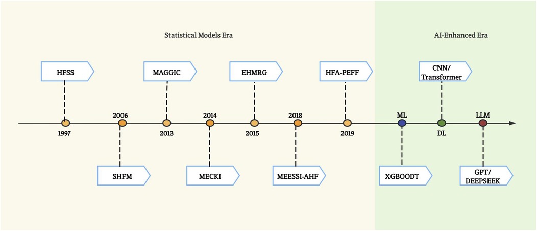 Practical implementation barriers also hinder widespread adoption. Many scoring systems require manual data entry, which is time-consuming and prone to errors. The evolution of HF prediction into the AI era (Figure 2) with higher accuracy has witnessed three technological waves: 1) ML, have the potential to improve classification performance over traditional statistical tools by taking into account nonlinear impacts of variables to arrive at an accurate prediction (59); 2) deep learning (DL) – a branch of ML, leveraging convolutional neural networks (CNN) and recurrent neural network (RNN) for risk prediction (60, 61), outperformed traditional ML models; 3) and large language models (LLMs) capable of parsing multimodal data from EHRs and wearable devices (62).