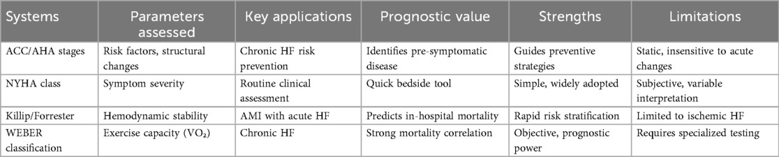 For Historically, risk stratification in HF has relied on grading systems that categorize disease severity based on clinical presentation, hemodynamic status, or functional capacity. These systems, while foundational, exhibit distinct conceptual frameworks and limitations. The ACC/AHA HF staging system classifies HF into four progressive stages (A–D), focusing on disease evolution from risk factors (stage A) to refractory symptoms (stage D) (6). This approach emphasizes prevention and early intervention but lacks granularity for dynamic symptom assessment, rendering it less responsive to short-term clinical changes. In contrast, the New York Heart Association (NYHA) classification evaluates symptom severity during daily activities (classes I–IV) and remains a cornerstone for routine clinical decision-making due to its simplicity (7). However, its subjective nature introduces interobserver variability, and it poorly discriminates HF patients across the spectrum of functional impairment (5, 8).