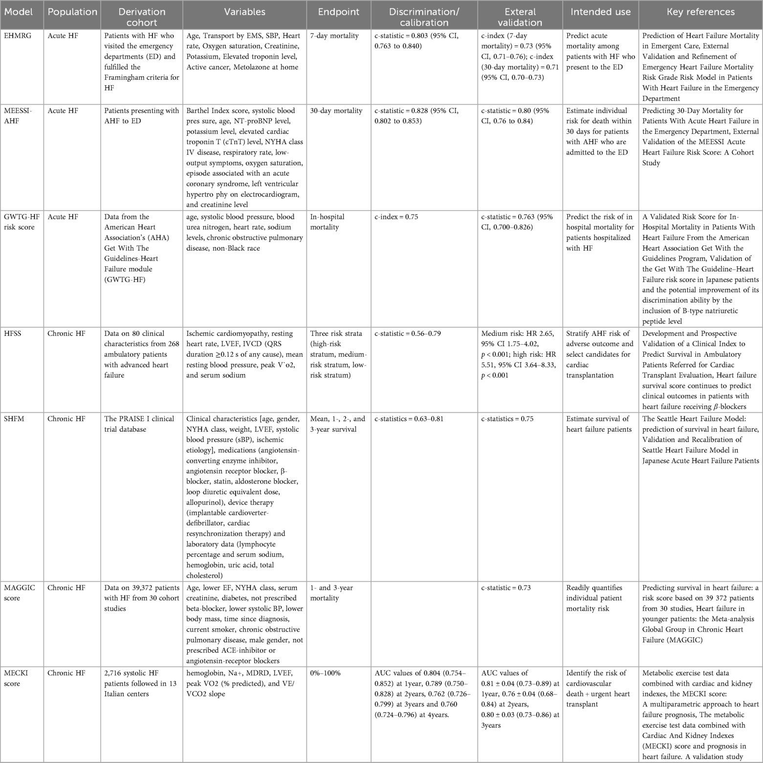 For acute HF, the Emergency Heart Failure Mortality Risk Grade (EHMRG) (28, 29) and Multiple Estimation of risk based on the Emergency department Spanish Score In patients with Acute Heart Failure (MEESSI-AHF) (30, 31) emerged as frontline tools. EHMRG, validated in >12,000 emergency department patients, uses seven variables (e.g., systolic blood pressure, troponin) to predict 7-day mortality (AUC 0.79). MEESSI-AHF, incorporating NT-proBNP and potassium levels, outperforms EHMRG in 30-day risk stratification (AUC 0.85 vs. 0.80). Both models prioritize rapid risk assessment but overlook longitudinal outcomes beyond 30 days.