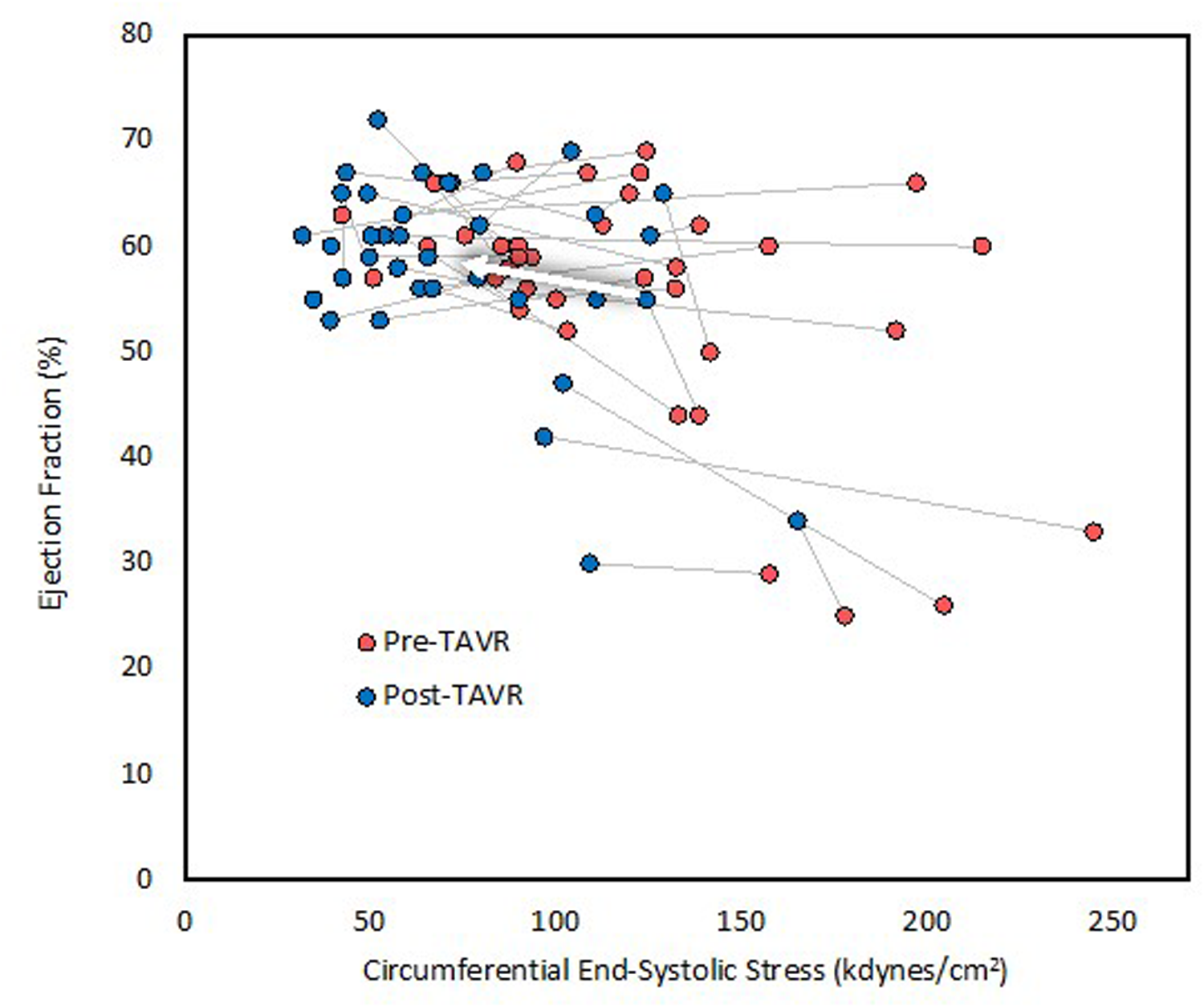 Thirty-six patients were included (61% women; mean age 77 years; mean Society of Thoracic Surgeons mortality risk score 3.6%). Following TAVR, there was a precipitous decline in circumferential end-systolic wall stress from 122 ± 47 to 74 ± 32 kdyn/cm2 (p < 0.001) and a slight increase in LVEF. Surprisingly, however, there was also an increase in the percentage of patients with depressed contractility from 22% (8) to 78% (28) (p < 0.001). Heart rate and ventricular volumes remained unchanged.