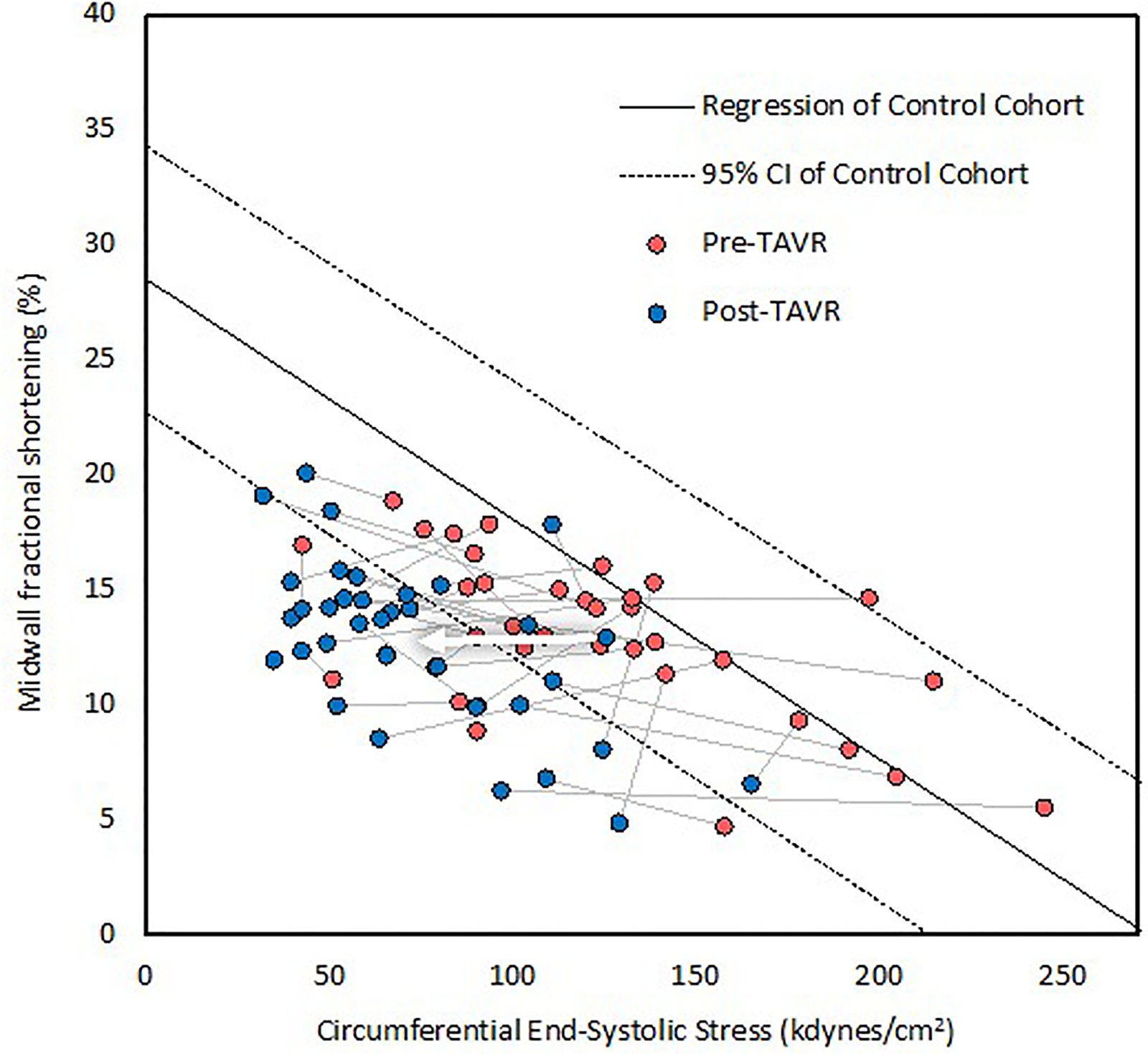 We studied consecutive patients with severe AS referred for TAVR without identifiable perioperative sources of negative inotropy or ventricular dyssynchrony. Preoperative and postoperative day one echocardiograms were compared with respect to hemodynamics, LV geometry, LVEF, and midwall fractional shortening (FSmw). Contractility was assessed by comparing observed FSmw values to those predicted based on the stress-shortening relation of healthy controls.
