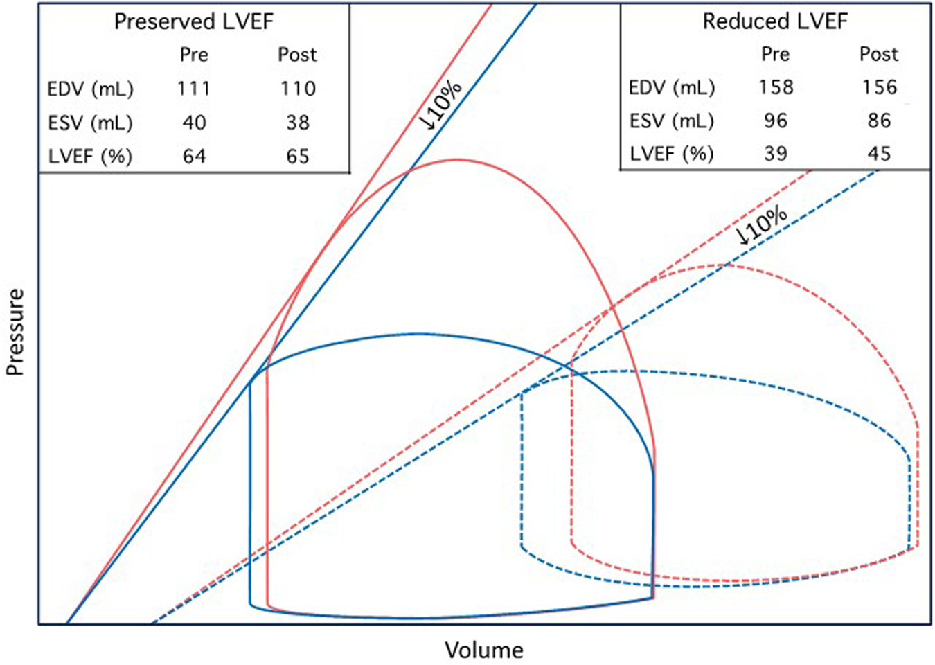 Transcatheter aortic valve replacement (TAVR) represents a unique opportunity to study LV mechanics in severe AS due to the immediate drop in afterload and because the confounding effects of thoracotomy and cardioplegia-related myocardial depression are obviated. While pooled results from several large trials suggest an inverse relationship between baseline LVEF and the magnitude of LVEF improvement following TAVR (8–21), recent work has demonstrated a lack of significant improvement or even a decline in LVEF following TAVR in patients with baseline LVEF >60% (22). This occurred despite a decrease in afterload as assessed by both wall stress and valvuloarterial impedance. Barring significant changes in preload, which is thought to only have a modest impact on LVEF at the extremes (23), these findings suggest contractility decline. However, given the 1-year interval between TAVR and repeat echocardiography in that study, it is difficult to discount a reduction in contractility through earlier and faster regression of myocyte hypertrophy than interstitial fibrosis (24, 25). While subsequent work demonstrated similar findings in the immediate postoperative period (26), the use of LVEF, even when indexed to wall stress, fails to account for LV concentric remodeling, which inherently confounds the assessment of contractility (1, 27).