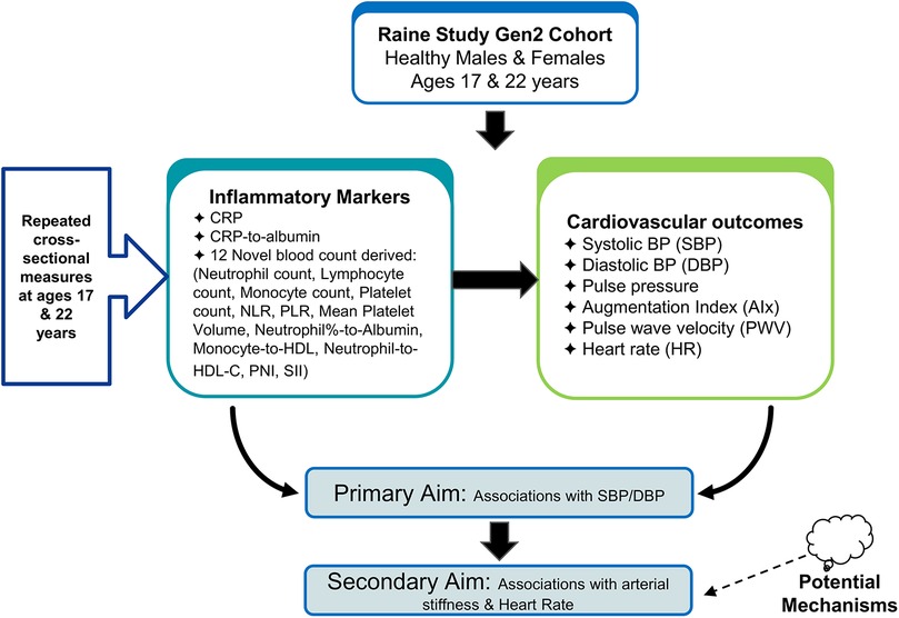 The aims of the study and study design are described in the flow diagram in Figure 1. Our primary aim was to investigate the association between CRP and CRP-to-albumin and 12 novel markers of inflammation (Neutrophil count, Lymphocyte count, Monocyte count, Platelet count, Neutrophil-to-lymphocyte ratio, Platelet-to-lymphocyte ratio, Monocyte-to-platelet volume, SII, monocyte-to-HDL ration, Neutrophil-to-HDL ratio, neutrophil percent-to-albumin and PNI), and systolic BP (SBP) and diastolic BP (DBP)). Our secondary aim was to investigate whether these blood count-derived inflammatory indices and CRP levels were associated with direct and indirect measures of arterial stiffness (pulse pressure (PP), augmentation index (AIx), pulse wave velocity (PWV), and heart rate (HR)) to assess potential mechanisms. We obtained repeat cross-sectional measures of blood counts and clinic BP at ages 17 and 22 years and AIx and PWV obtained at age 17 in a population of healthy males and females from the Raine Study.