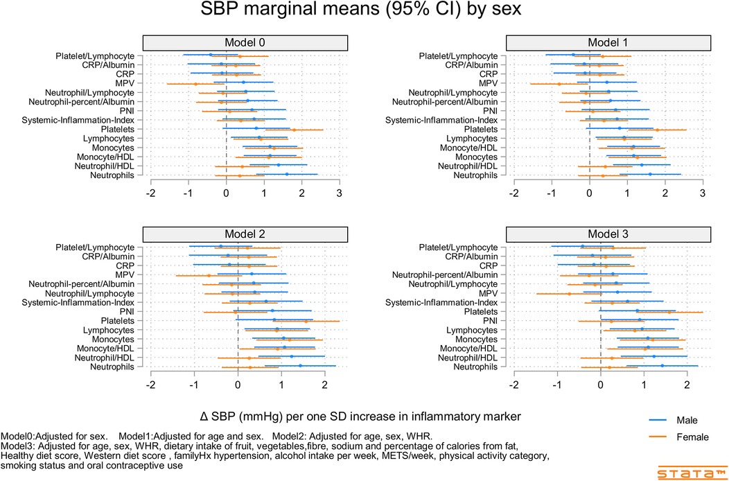 Figure 2. Predicted marginal mean effect of inflammatory markers on clinic systolic blood pressure for males (N = 363) and females (N = 330).