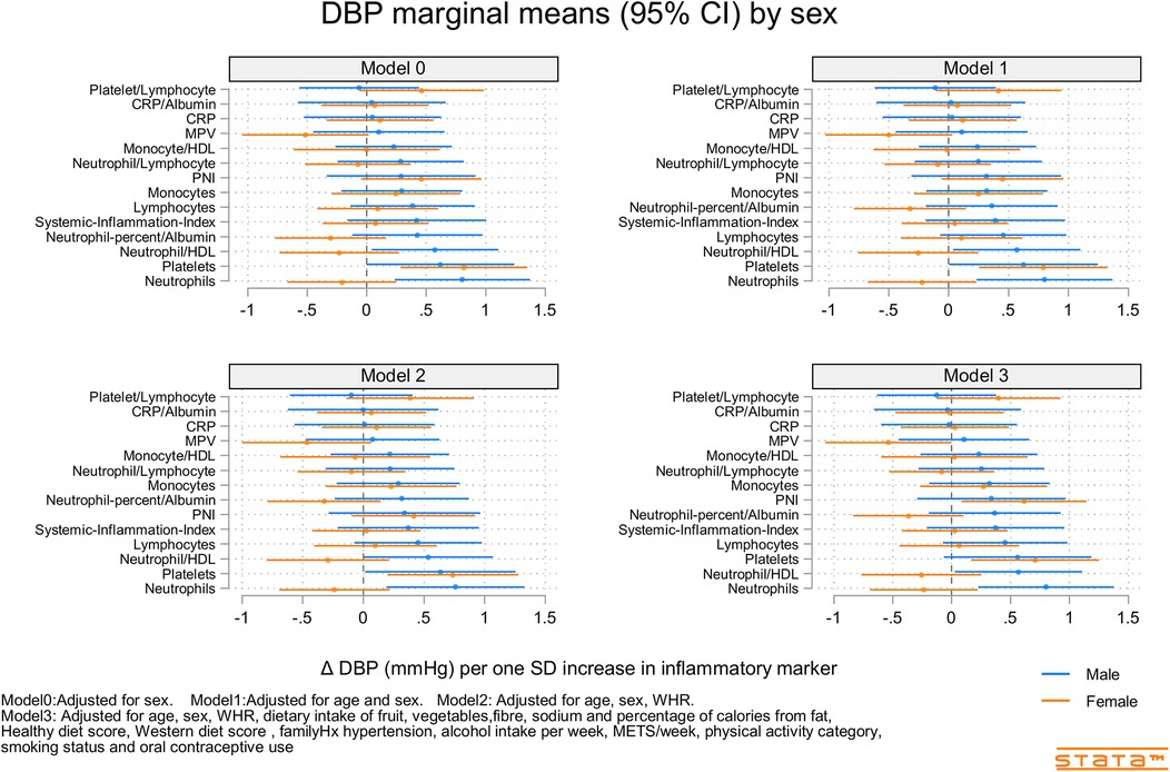 Figure 3. Predicted marginal mean effect of inflammatory markers on clinic diastolic blood pressure for males (N = 363) and females (N = 330).