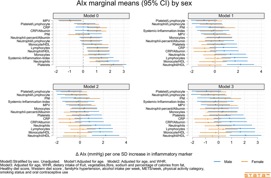 Figure 4. Predicted marginal mean effects of inflammatory markers on AIx for males (N = 344) and females (N = 301).
