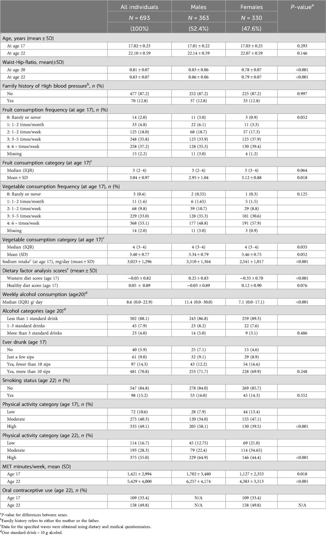 Demographic data, including smoking status (yes/no), level of physical activity (low/moderate/high), use of oral or hormonal contraceptives (at ages 17 and 22), and alcohol consumption by age 17 (none/just-a-few-sips/less-than-10-sips/more-than-10-sips), were recorded in the medical questionnaires. An international physical activity questionnaire (IPAQ) recorded the metabolic equivalents (METs) at 17 and 22 years of age. Clinical assessments included the waist-to-hip ratio (WHR). Information on the family history of high BP in either the mother or father was recorded at the age of eight years. Supplementary Figure S1 provides details on the number of individuals assessed for each measurement at 17- and 22-years, and the extent of missing information.