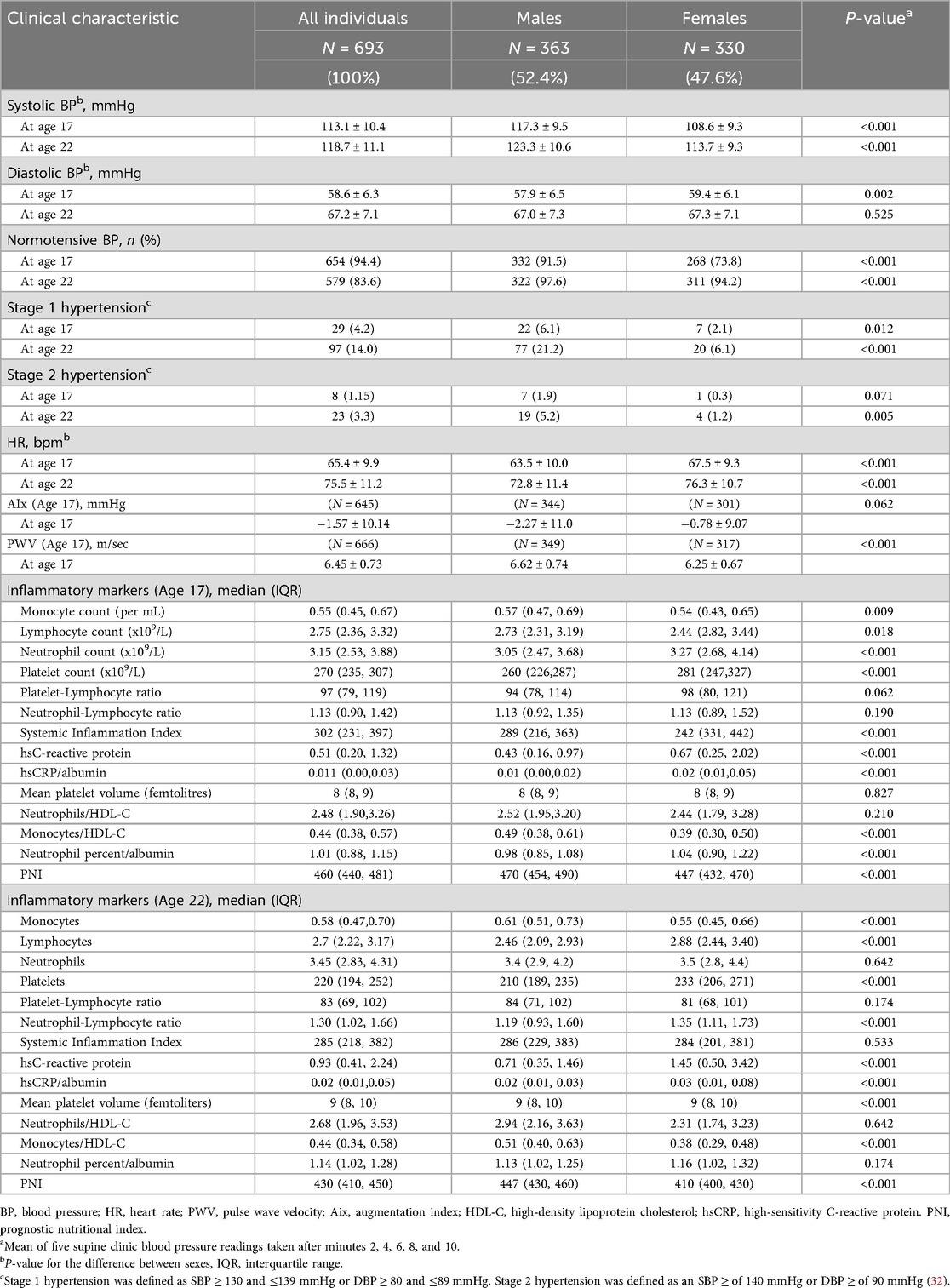Table 1 shows the demographic and lifestyle characteristics of 693 participants. There were slightly more males (n = 363, 52.4%) than females (n = 330, 47.6%), and the overall mean (±SD) WHR across all participants was 0.81 ± 0.07 at age 17 and 0.83 ± 0.07 at age 22, with females having a lower WHR than males at age 17 and 22 (p < 0.001). Participants generally met fruit, vegetable, and alcohol recommendations at ages 17 and 22 years, according to the Australian Guide to Healthy Eating (AGHE). Western diet factor scores and healthy diet factor scores at age 17 were comparable to the full Raine Study Gen2 cohort with means (±SD) of −0.05 ± 0.82 and 0.05 ± 0.89 respectively and close to zero. However, females had a slightly healthier profile than males for the Western diet factor score (−0.35 ± 0.70 vs. 0.25 ± 0.83, p < 0.001) but were similar for the healthy diet factor score (0.12 ± 0.90 vs. −0.03 ± 0.89, p = 0.076). The median alcohol consumption at age 20 was slightly lower among females than males [7.1 (0.0–17.1) g/day vs. 11.4 (0.0–30.0) g/day, p < 0.001]. Most participants (N = 547, 84.8%) were non-smokers at the age of 22 years. Males were higher in the physical activity category and in mean MET mins/week at both ages 17 and 22 than females. Table 2 describes the inflammatory markers BP, HR, AIx, and PWV in the participants. Most of the study participants were normotensive (SBP < 130 mmHg and DBP < 80 mmHg) (32) at age 17 (94.4%) and at age 22 (83.6%), with the overall mean (±SD) SBP at age 17 being 117.3 ± 9.5 for males and 108.6 ± 9.3 mmHg for females (p < 0.001). At age 22, the corresponding mean SBP was 123.3 ± 10.6 and 113.7 ± 9.3 mmHg (p < 0.001). Among the inflammatory markers, monocyte count (p = 0.009 and p < 0.001) and monocyte/HDL-C ratio (p < 0.001 for each) were higher in males than in females at ages 17 and 22, while hsCRP was higher in females than in males at both ages (p < 0.001 for each), as was the platelet count (p < 0.001 for each).