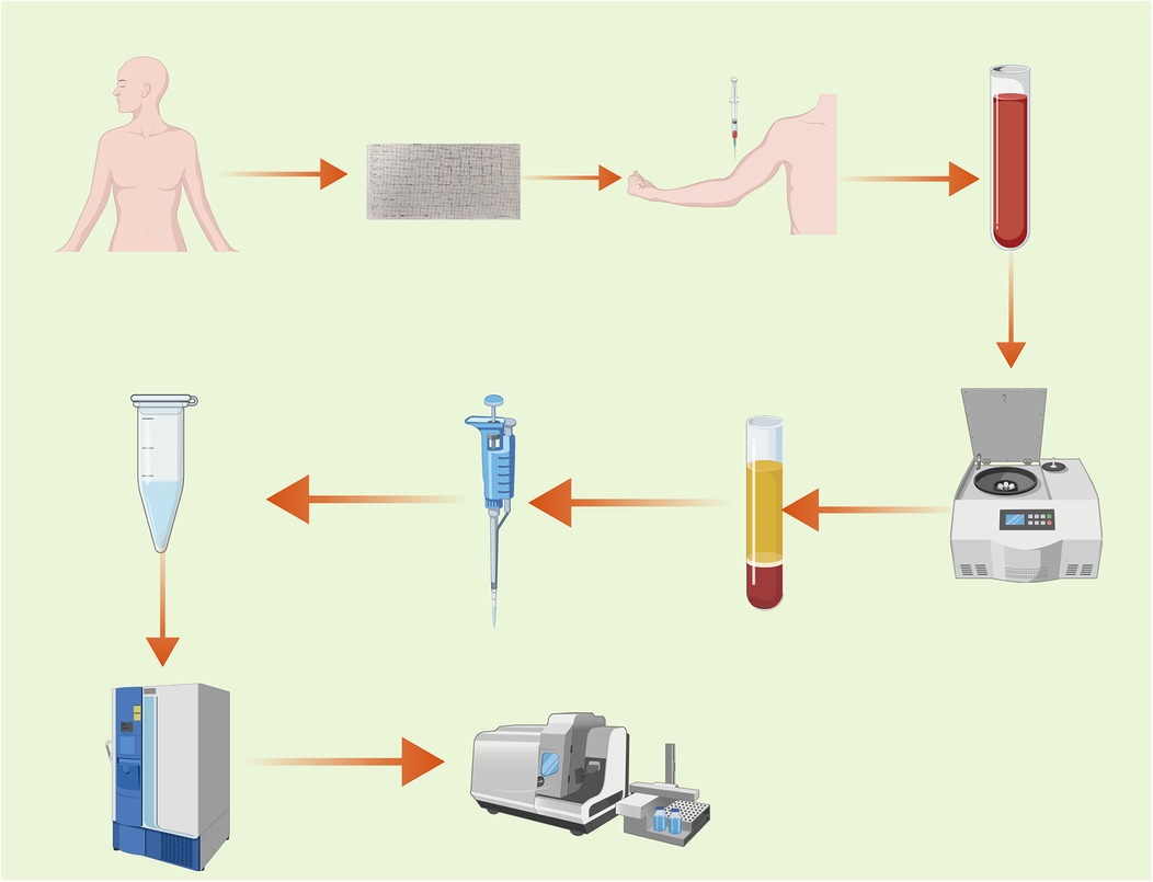 Blood samples were collected from all eligible subjects after fasting overnight. All blood samples were collected with the informed consent and permission of the patients. After standing for 1 h, the blood samples were centrifuged at 3,000 g for 15 min to separate the serum and blood cells. The collected serum was placed in a standard serum collection tube and stored at −80°C until the test was conducted.