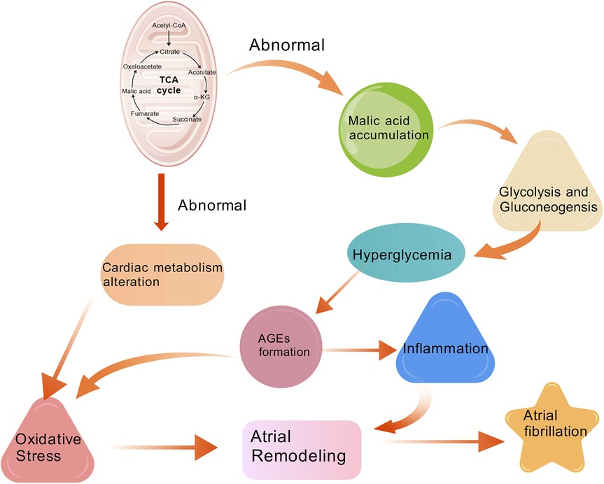 In addition, malic acid is an important substance in the glucagon signaling pathway. Malic acid promotes the transport of intracellular glucose to the extracellular space through glycolysis and gluconeogenesis, which raise blood glucose levels. Some studies have shown that the level of oxidative stress and atrial fibrosis were markedly increased in the subgroup of mice with wide glycemic variability and were strongly associated with enhanced AF inducibility in electrophysiological evaluation (38). Elevated extracellular blood glucose also promotes the formation of advanced glycation end products (AGEs). AGES are produced by the non-enzymatic condensation of the carbonyl group of a reducing sugar with the free amine group of a nucleic acid, protein or lipid, and then further rearrangement to produce a stable and irreversible end product (39). A large amount of evidence suggests that oxidative stress and inflammation are the central mediators of AF in the heart under metabolic stress (40–42). AGES can promote oxidative stress and inflammatory responses by altering its structure and function through binding to cell surface receptors or cross-linking to body proteins, thereby exerting pathological effects (43). KATO T reported a significant increase of atrial fibrosis and AGE-E2 expression in diabetic rats that was induced by streptozotocin, and that fibrosis in the model was partially reversed after treatment with AGES inhibitors. That suggested a causal relationship between AGE levels, atrial fibrosis and AF (44). Additional studies have shown that insulin deficiency and glycemic variability impair Phosphatidylinositol 3-kinase (PI3K) signaling pathway and bring about ionic and metabolic dysregulations capable of triggering atrial arrhythmias (45).