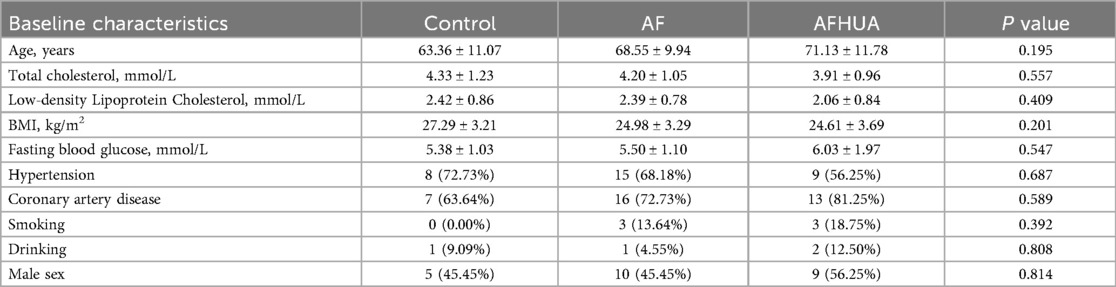 Atrial fibrillation (AF) is the most common type of arrhythmia worldwide (1). There are approximately 33.5 million people with atrial fibrillation worldwide, and the incidence rate in China is 1–2 percent (2). Atrial fibrillation can significantly affect the quality of life of patients because it is associated with serious complications such as stroke, heart failure, cognitive impairment and cardiac arrest (3). Although the clinical manifestations of atrial fibrillation are diverse. Its pathogenesis is not yet fully understood. It is currently believed to involve a combination of factors, including structural remodeling, electrical remodeling, inflammatory response, and oxidative stress (4). Hyperuricemia (HUA) is a metabolic disease caused by an imbalance of purine metabolism and uric acid production-excretion (5). HUA is defined as uric acid levels >7.0 mg/dl in men and >5.7 mg/dl in women (6). As is well-known, HUA leads to the formation and deposition of monosodium urate crystals in and around the joints, which in turn triggers gout (7). However, recent studies have found that HUA has been confirmed to be associated with the onset of multiple cardiovascular diseases. Our previous study found a significant link between HUA and the occurrence of AF. Leonardo Tamariz et al. also found that serum uric acid levels were significantly associated with new-onset atrial fibrillation in a concentration-dependent manner (8). To further investigate this association, we used non-targeted metabolomics techniques to conduct serum metabolomics analyses of different populations in three groups: the Control group, the atrial fibrillation group (AF), and the atrial fibrillation with hyperuricemia group (AFHUA), to explain this association at the metabolomics level.