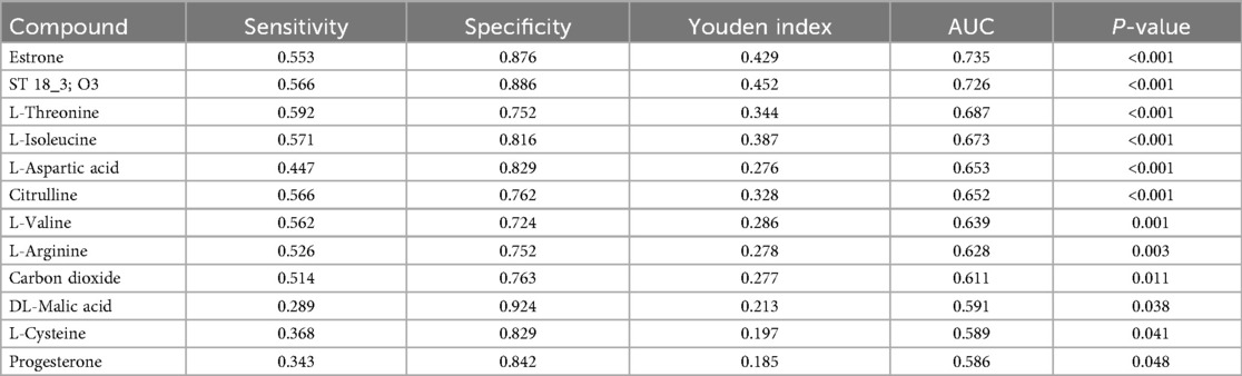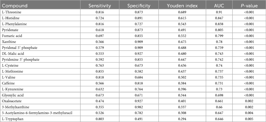 For the identified differential metabolites, further screening was conducted under the conditions of P < 0.05, value of variable importance in projection (VIP) > 1 (22), and enrichment to significant metabolic pathways (impact value >0.05, P < 0.05) (10). Then ROC curves were used to evaluate the predictive power of these differential metabolites for AFHUA.