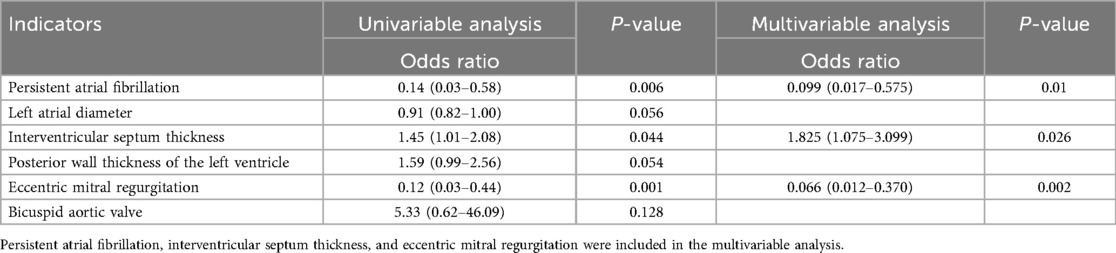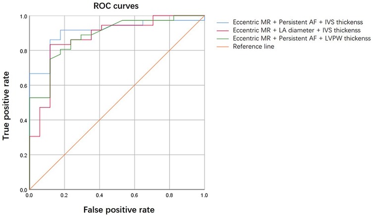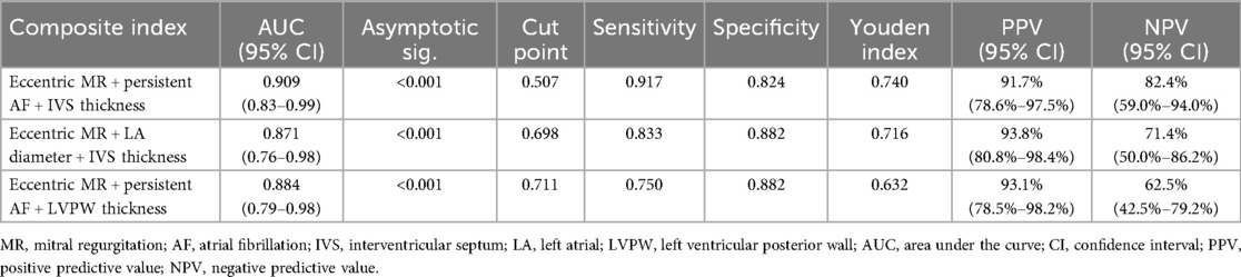 Results: At 1-year follow-up, MR improvement was observed in 67.9% of patients. Multivariable analysis identified persistent atrial fibrillation [odds ratio (OR): 0.099, 95% CI: 0.017–0.575; P = 0.01] and eccentric MR (OR: 0.066, 95% CI: 0.012–0.370; P = 0.002) as independent negative predictors of improvement. Conversely, greater interventricular septal thickness (OR: 1.825, 95% CI: 1.075–3.099; P = 0.026) was a positive predictor. A composite predictive index integrating these three variables demonstrated excellent discriminative ability, with an area under the receiver operating characteristic curve of 0.909.