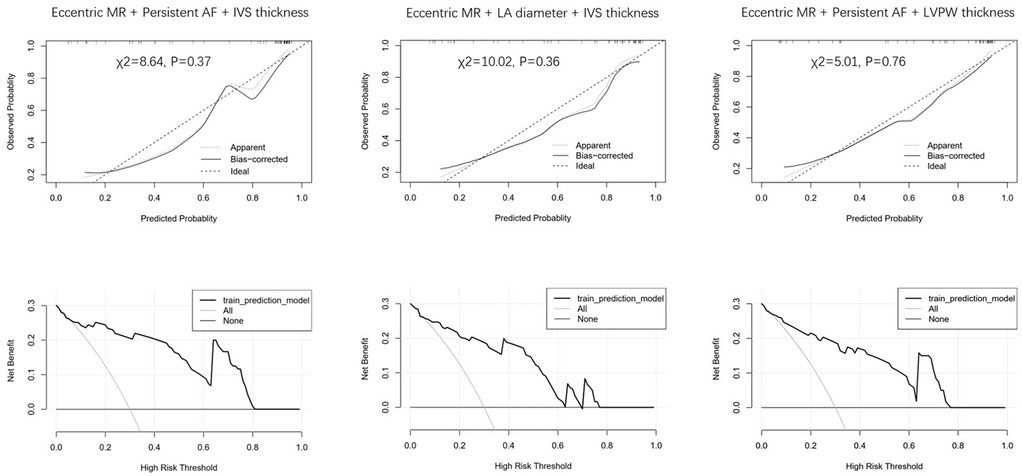 The logistic regression analysis included persistent AF, left atrial diameter, interventricular wall (IVS) thickness, left ventricular posterior wall (LVPW) thickness, eccentric MR, and bicuspid aortic valve. Persistent AF [OR: 0.14 (95% CI: 0.03–0.58), P = 0.006] and eccentric MR [OR: 0.12 (95% CI: 0.03–0.44), P = 0.001] were independent negative predictors of MR improvement. In contrast, IVS thickness emerged as a positive predictor of MR improvement [OR: 1.45 (95% CI: 1.01–2.08), P = 0.044] (Table 4). The combination of eccentric MR, persistent AF, and IVS thickness constituted a powerful predictor [area under the curve (AUC) = 0.909 (95% CI: 0.83–0.99), P < 0.001] (Figure 1). The optimal cut point for this index was 0.507, yielding the highest overall accuracy, as reflected by the greatest Youden Index (J = 0.74). At this threshold, the index demonstrated excellent clinical utility: The positive predictive value (PPV) was 91.7% (95% CI: 62.0%–99.8%) and the negative predictive value (NPV) was 82.4% (95% CI: 59.0%–94.0%) (Table 5). Because atrial fibrillation was significantly correlated with the left atrial diameter, and interventricular septal thickness was highly correlated with left ventricular posterior wall thickness, we developed composite indices by combining these parameters with eccentric regurgitation, which demonstrated comparable predictive values without statistical significance (Figure 1 and Table 5, Supplementary Table 1). Model validation results demonstrated favorable predictive performance. The Hosmer–Lemeshow test indicated a robust goodness of fit (P > 0.05 for all three composite indices). The calibration curves showed that both the apparent and the bias-corrected curves closely followed the ideal diagonal line, confirming the accuracy of the predicted probabilities. The decision curve analysis further revealed that the use of our model for clinical decision-making yielded a higher net benefit across a wide range of threshold probabilities (0.1–0.8) compared with the “treat all” or “treat none” strategies (Figure 2).