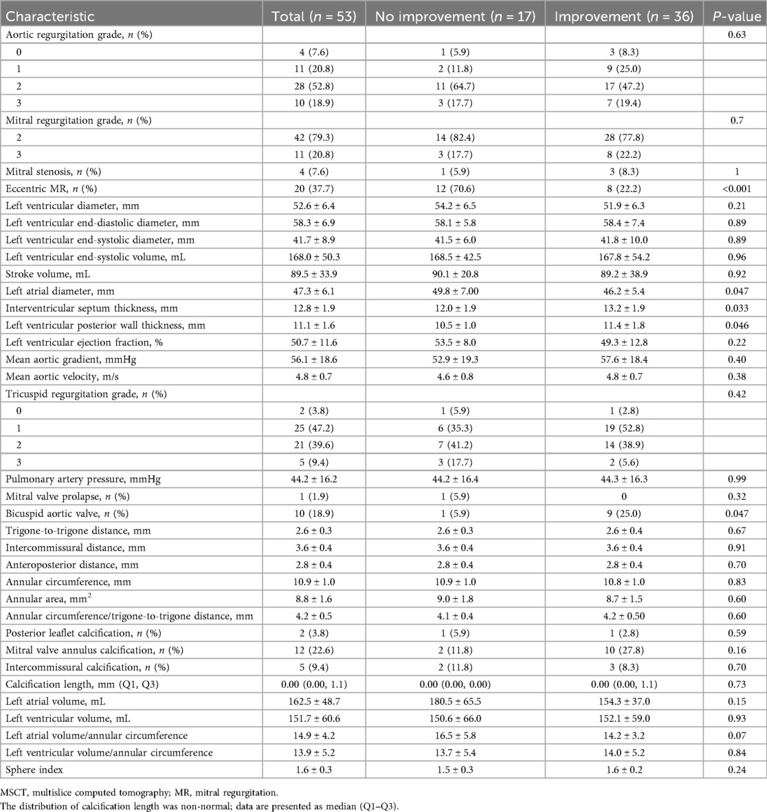 A majority of the patients (79.3%) had moderate MR. Concomitant moderate aortic regurgitation and severe aortic regurgitation were observed in 52.83% and 18.87% of the patients, respectively. Four patients (7.5%) had mild mitral stenosis, and one had mitral valve prolapse (without a flail leaflet). Eccentric MR was significantly more prevalent in the non-improvement group (70.6% vs. 22.2%, P < 0.05). No significant differences were observed in left ventricular diameters or stroke volume between the improvement and the non-improvement groups. However, the improvement group demonstrated greater interventricular septal thickness (13.2 ± 1.9 vs. 12.0 ± 1.9 mm, P = 0.033) and posterior wall thickness (11.4 ± 1.8 vs. 10.5 ± 1.0 mm, P = 0.046). Bicuspid aortic valves were also more common in the improvement group (25.0% vs. 5.9%, P = 0.047). No significant differences were found in mitral annular dimensions, calcification length, or atrial/ventricular volumes (Table 2).