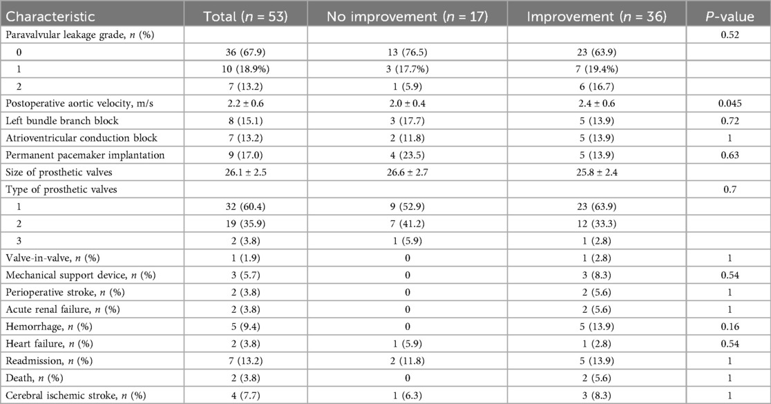Perioperative complications were moderate paravalvular leaks and new-onset complete atrioventricular block. The leaks occurred in seven patients (13.21%); permanent pacemaker implantation was required in seven other patients because of new-onset complete atrioventricular block. Other complications included stroke (3.77%), acute kidney injury (3.77%), and bleeding (9.43%). Aortic peak velocity following TAVR was higher in the improvement group (2.35 ± 0.61 vs. 2.02 ± 0.40 m/s, P = 0.045) than in the non-improvement group. One-year readmission and mortality rates were 13.21% (primarily due to heart failure or stroke) and 3.77% (attributed to sudden death and pneumonia), respectively (Table 3). Among the 36 patients who showed a reduction in mitral regurgitation, the extent of improvement followed a graded distribution: One patient improved by three grades, five patients by two grades, and the remaining thirty by one grade (data not available).