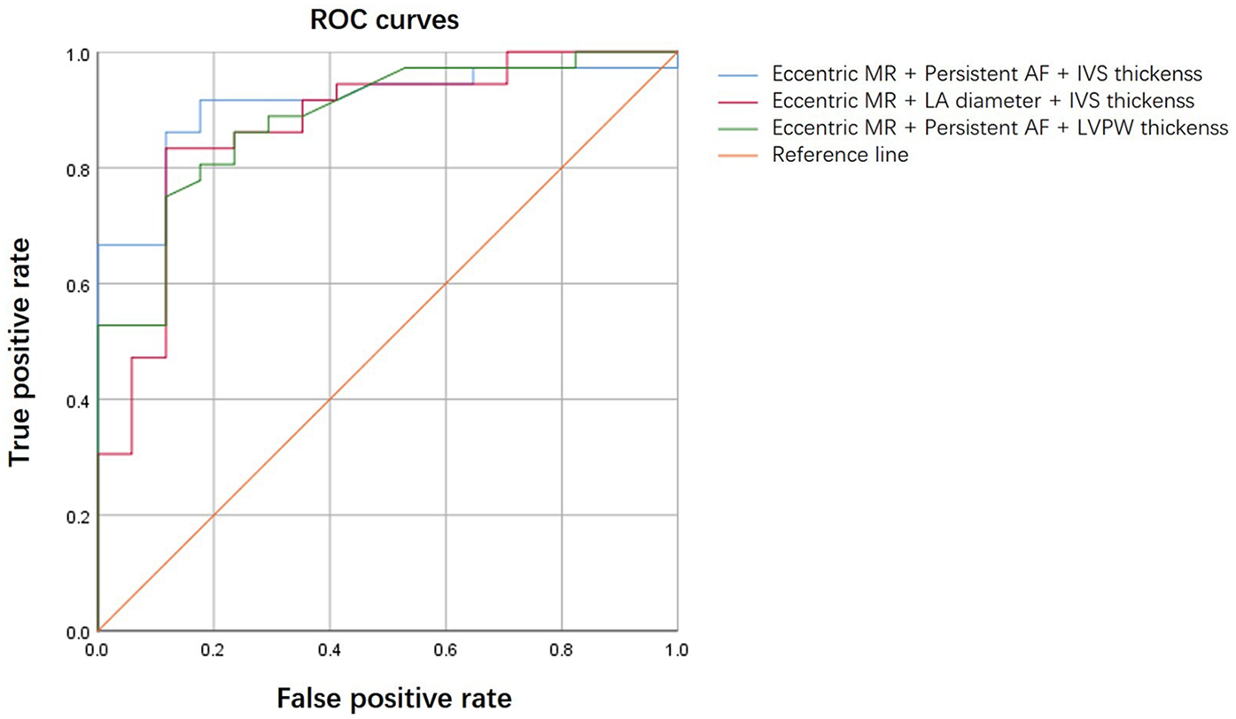 At 1-year follow-up, MR improvement was observed in 67.9% of patients. Multivariable analysis identified persistent atrial fibrillation [odds ratio (OR): 0.099, 95% CI: 0.017–0.575; P = 0.01] and eccentric MR (OR: 0.066, 95% CI: 0.012–0.370; P = 0.002) as independent negative predictors of improvement. Conversely, greater interventricular septal thickness (OR: 1.825, 95% CI: 1.075–3.099; P = 0.026) was a positive predictor. A composite predictive index integrating these three variables demonstrated excellent discriminative ability, with an area under the receiver operating characteristic curve of 0.909.