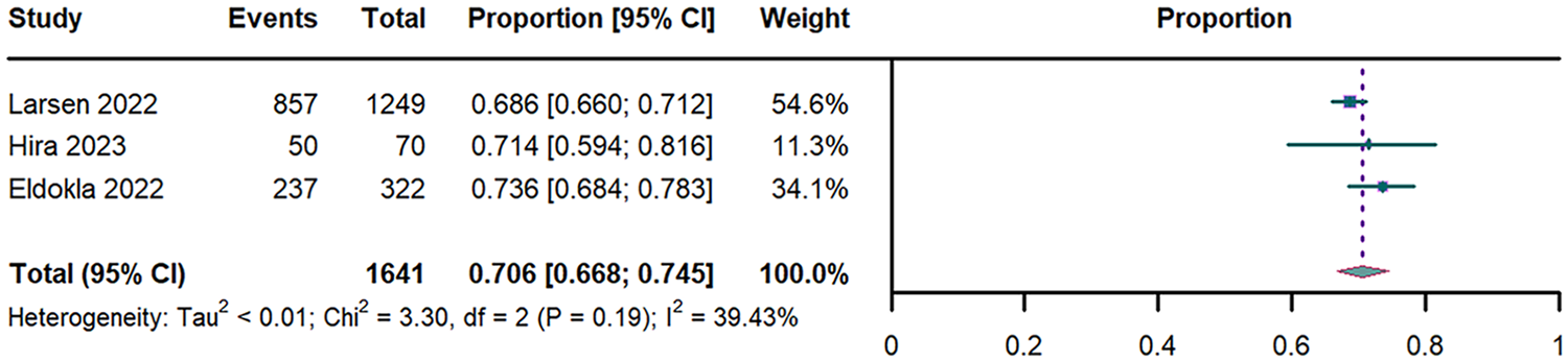 Pooled analysis of 3 studies (n = 1,641) (29–31) revealed an overall OI prevalence was 70.6% (95% CI: 66.8%–74.5%; I2 = 39.43%; Figure 2).