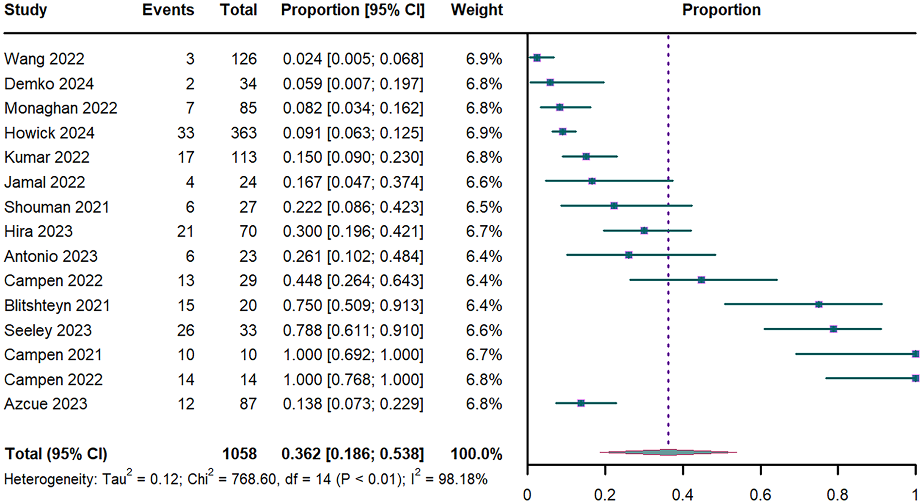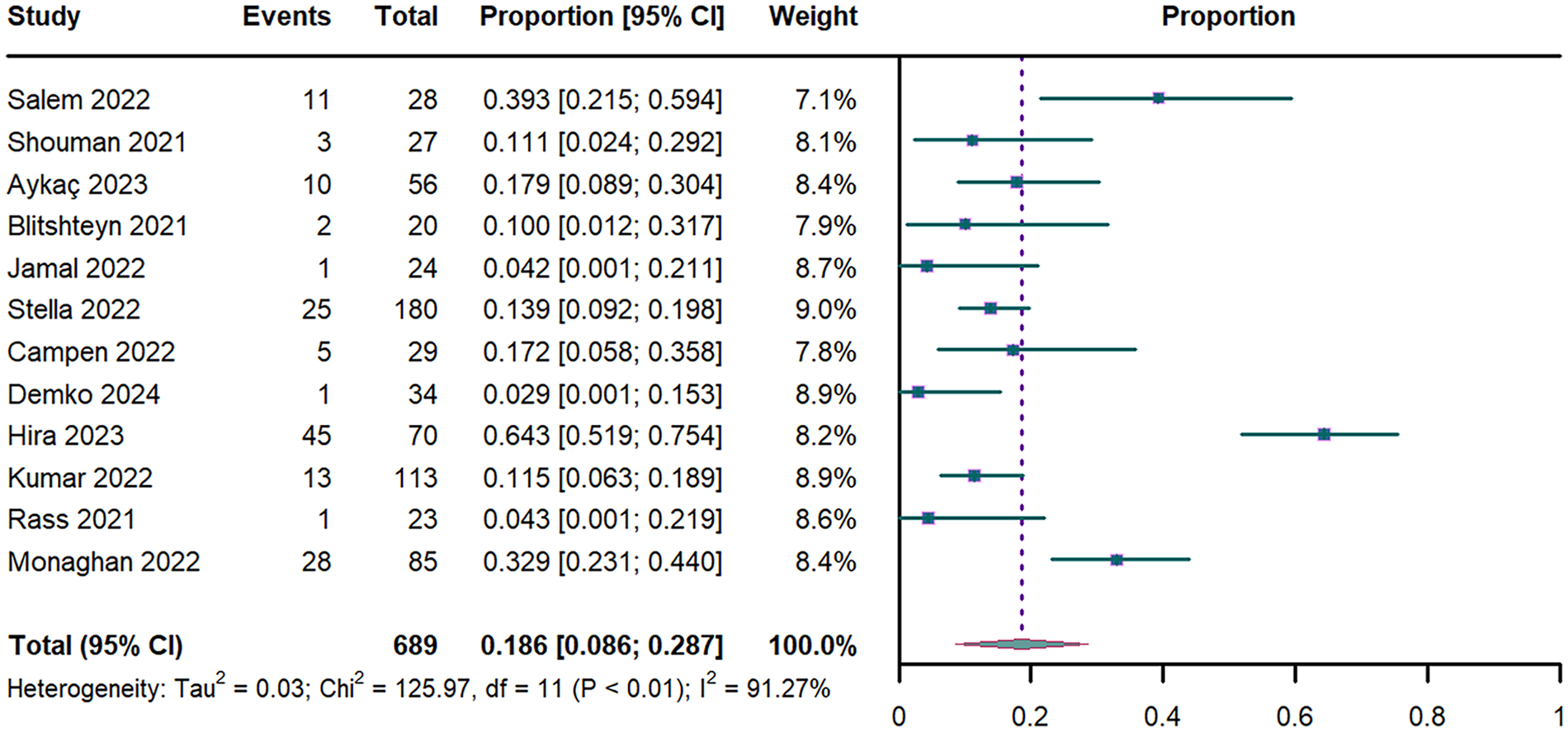 Forest plot of POTS prevalence. POTS: postural orthostatic tachycardia syndrome; CI: confidence interval; df: degree of freedom.