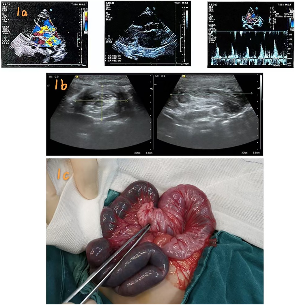 Figure 1. (a) Preoperative echocardiography findings; (b) Ultrasound “target sign” confirming ileocolic intussusception; (c) Intraoperative view showing ischemic ileum and intussuscepted segment.