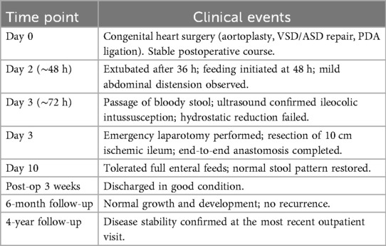 Postoperative intussusception (PI) is an uncommon complication in children, accounting for approximately 2% of all pediatric intussusception cases (1). Most PI cases are associated with previous abdominal surgery, although isolated occurrences have been reported after thoracic (including cardiac) or cervical procedures (1, 2). Intussusception itself is the most frequent cause of acute intestinal obstruction in infants, with an incidence of 0.3–0.7 per 1,000 live births. Approximately 90%–95% of pediatric intussusception cases are idiopathic, while only 5%–10% are related to identifiable pathological lead points such as polyps or Meckel's diverticulum (3). PI following cardiac surgery is particularly rare. Its pathogenesis is believed to be multifactorial, involving transient intestinal dysmotility induced by anesthetics or opioids, mesenteric hypoperfusion during cardiopulmonary bypass, postoperative inflammation, and electrolyte imbalance (2, 4). Unlike primary intussusception, PI often lacks the classic triad of abdominal pain, vomiting, and bloody stool. Instead, it usually presents with nonspecific signs of progressive intestinal obstruction, which may easily be mistaken for adhesive obstruction (1). This case report, prepared in accordance with the CARE checklist, highlights the diagnostic and therapeutic challenges of postoperative ileocolic intussusception occurring shortly after congenital heart surgery in an infant.