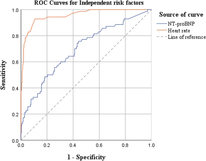 Based on the results of the multivariate logistic regression analysis above, we further explored the predictive efficacy of independent risk factors—ventricular rate and NT-proBNP—for postoperative AF in lung cancer patients (ROC curve analysis is shown in Figure 1).