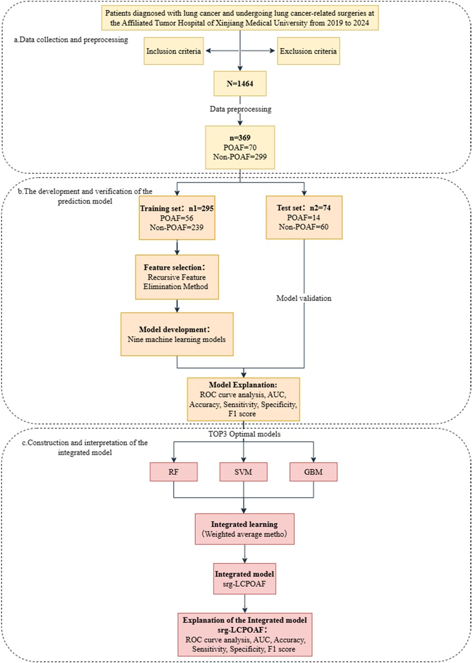 This study aims to develop an ensemble prediction model for POAF in lung cancer patients with enhanced interpretability. By integrating 46 predictor variables across clinical characteristics, surgical parameters, preoperative laboratory markers, and cardiopulmonary function, we achieved multi-dimensional feature fusion to improve accuracy. We selected the top three performing machine learning models for ensemble integration, yielding a model (srg-LCPOAF) with superior predictive performance to individual algorithms. Comprehensive interpretation of the ensemble model was conducted to validate its clinical utility in POAF prediction.
