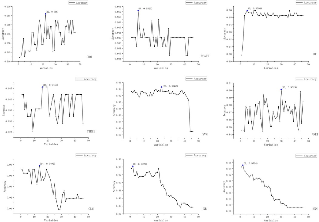 We employed the Recursive Feature Elimination (RFE) strategy for feature selection, determining the optimal feature subset for each machine learning prediction model. The RFE variable selection process for each model is visualized in Figures 3, 4.