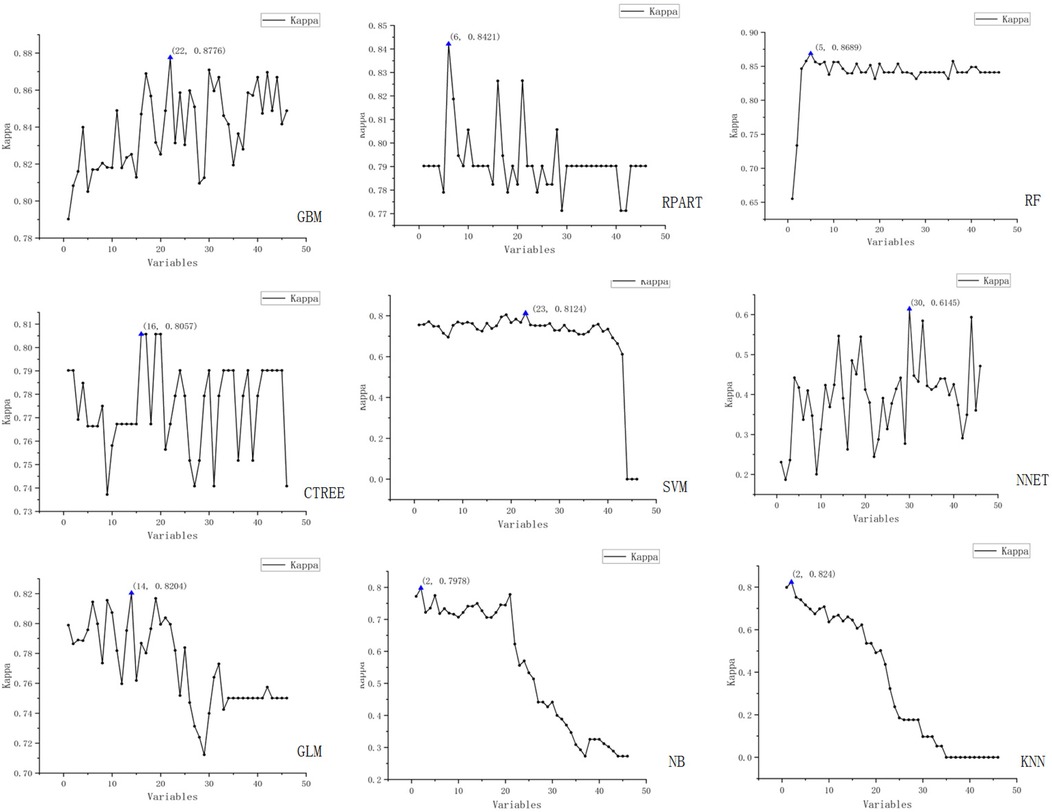 The figure displays the results of recursive feature elimination for nine different machine learning models. Each plot shows the relationship between the number of variables and cross-validated accuracy/Kappa values, where the x-axis represents the number of variables and the y-axis denotes the accuracy and Kappa values obtained via cross-validation.
