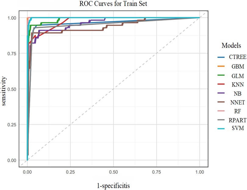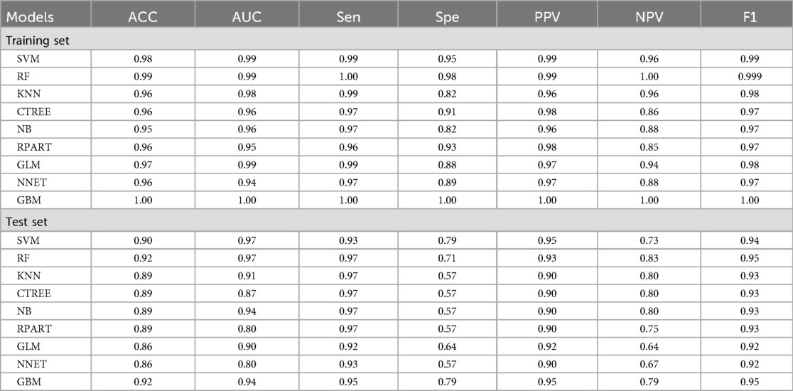 The machine learning models constructed after feature screening showed significant differences in performance between the training and test sets (Table 3).