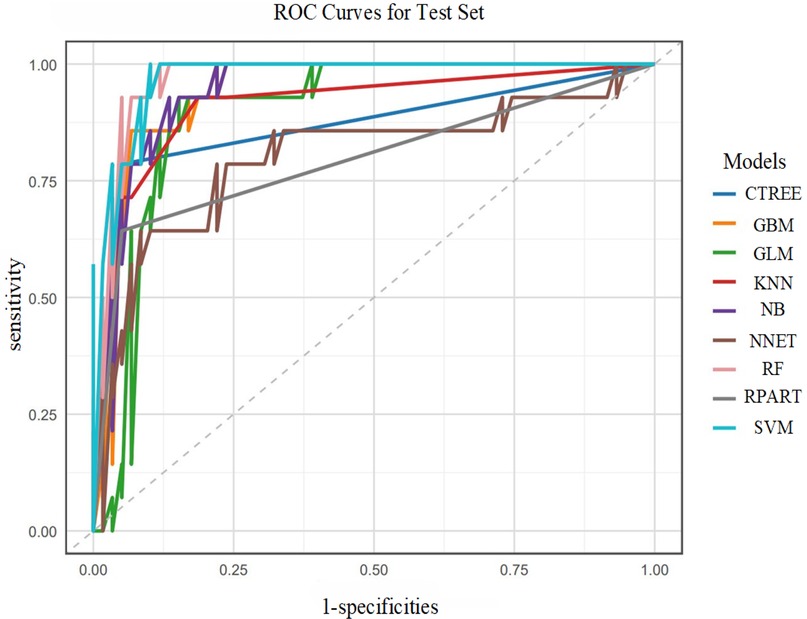 In the test set, the SVM model exhibited the best performance, with an AUC of 0.9734. Correspondingly, the SVM model also showed relatively high accuracy (0.9041), sensitivity (0.9322), specificity (0.7857), PPV (0.9483), NPV (0.7333), and F1 score (0.9402). Additionally, the RF and GBM models ranked among the top in predictive performance: the RF model had an AUC of 0.9697, accuracy of 0.9178, sensitivity of 0.9661, specificity of 0.7143, PPV of 0.9344, NPV of 0.8333, and F1 score of 0.9500; the GBM model had an AUC of 0.9431, accuracy of 0.9178, sensitivity of 0.9492, specificity of 0.7857, PPV of 0.9492, NPV of 0.7857, and F1 score of 0.9492 as shown in Figure 6.