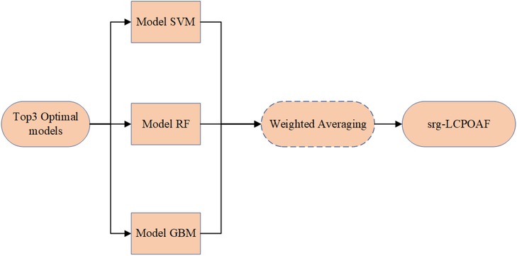Based on the comparison of performance parameters (primarily ACC values) of the nine machine learning prediction models, the top three models with the best predictive performance were identified as the SVM, RF, and GBM models. An ensemble of these three models was then performed by assigning weights proportional to their ACC values on the test set (the workflow is shown in Figure 7), ultimately forming the integrated model srg-LCPOAF.