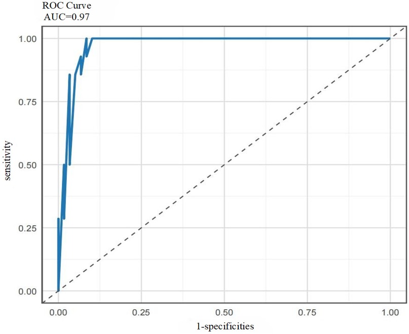 Based on the ROC curve analysis of the ensemble model srg-LCPOAF (Figure 8), the curve rapidly ascends from the lower-left corner (0,0) to the upper-left corner (0,1) and then extends rightward to (1,1), indicating that the model achieves high sensitivity (Sen) at low false positive rates (1-Spe) and exhibits excellent classification performance. With an AUC value of 0.97, the model demonstrates stable discrimination between positive and negative samples across different thresholds and strong robustness to noise or variations in data distribution.